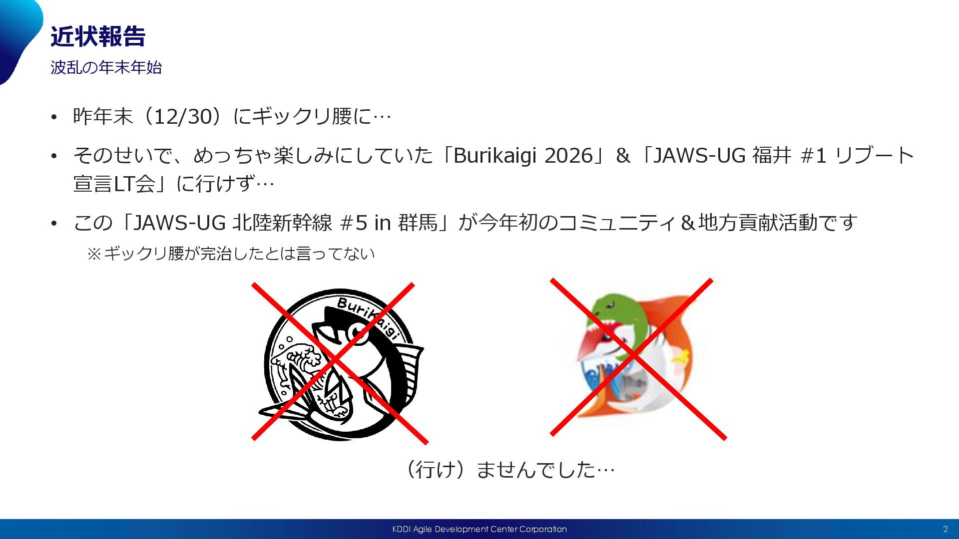 • そのせいで、めっちゃ楽しみにしていた「Burikaigi 2026」&「JAWS-UG 福井 #1 リブート 宣言LT会」に行けず… • この「JAWS-UG 北陸新幹線 #5 in 群馬」が今年初のコミュニティ&地方貢献活動です ※ギックリ腰が完治したとは言ってない (行け)ませんでした…