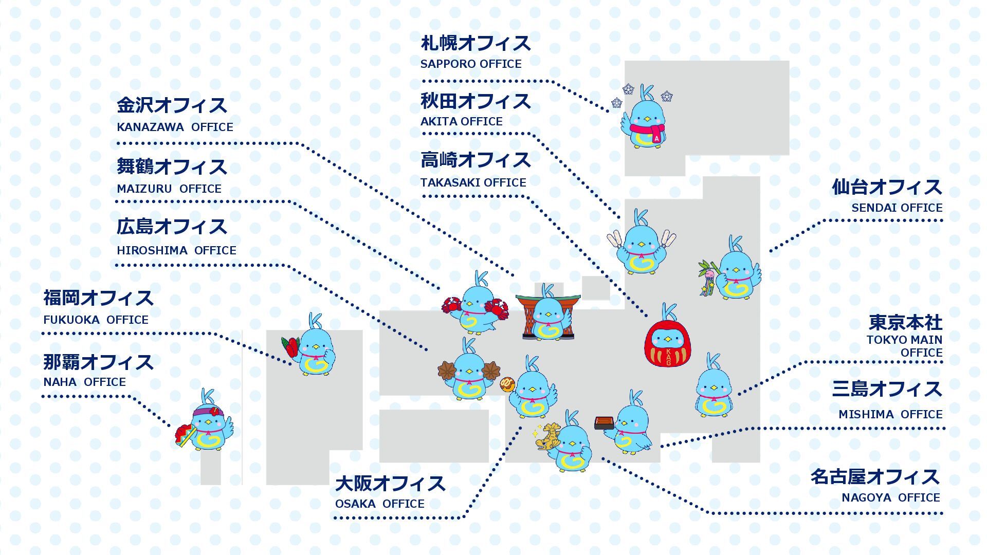 KANAZAWA OFFICE 舞鶴オフィス MAIZURU OFFICE 広島オフィス HIROSHIMA OFFICE 福岡オフィス FUKUOKA OFFICE 那覇オフィス NAHA OFFICE 仙台オフィス SENDAI OFFICE 東京本社 TOKYO MAIN OFFICE 三島オフィス MISHIMA OFFICE 名古屋オフィス NAGOYA OFFICE 大阪オフィス OSAKA OFFICE