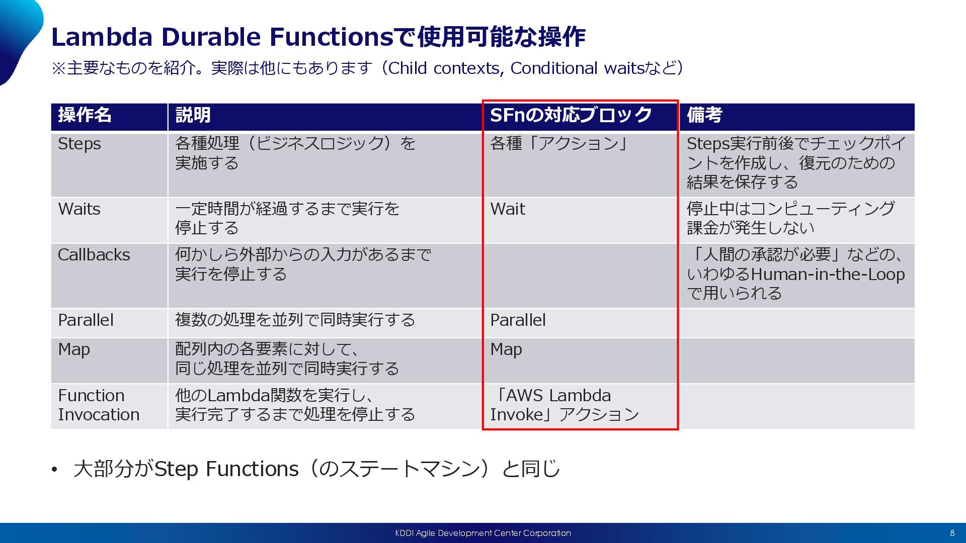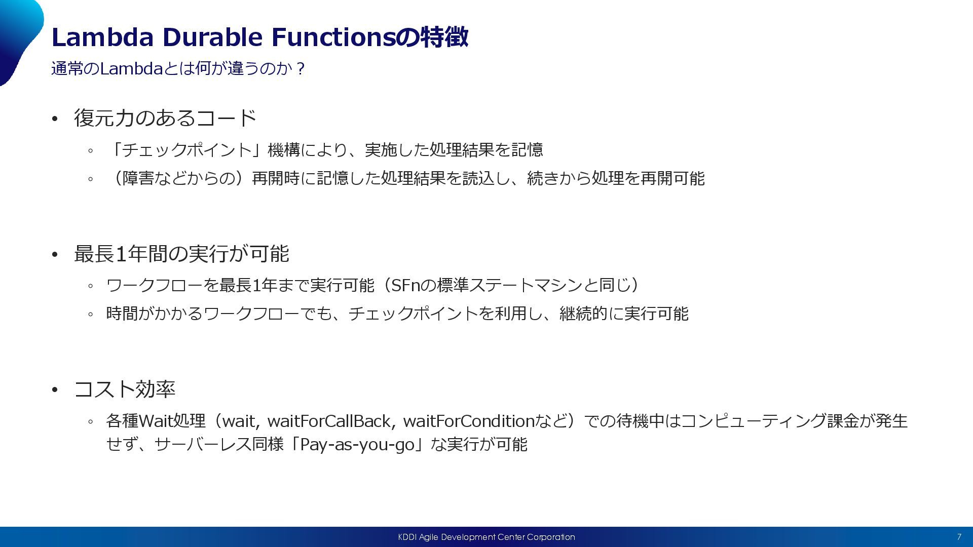 7. 7 KDDI Agile Development Center Corporation Lambda Durable Functionsの特徴 通常のLambdaとは何が違うのか?