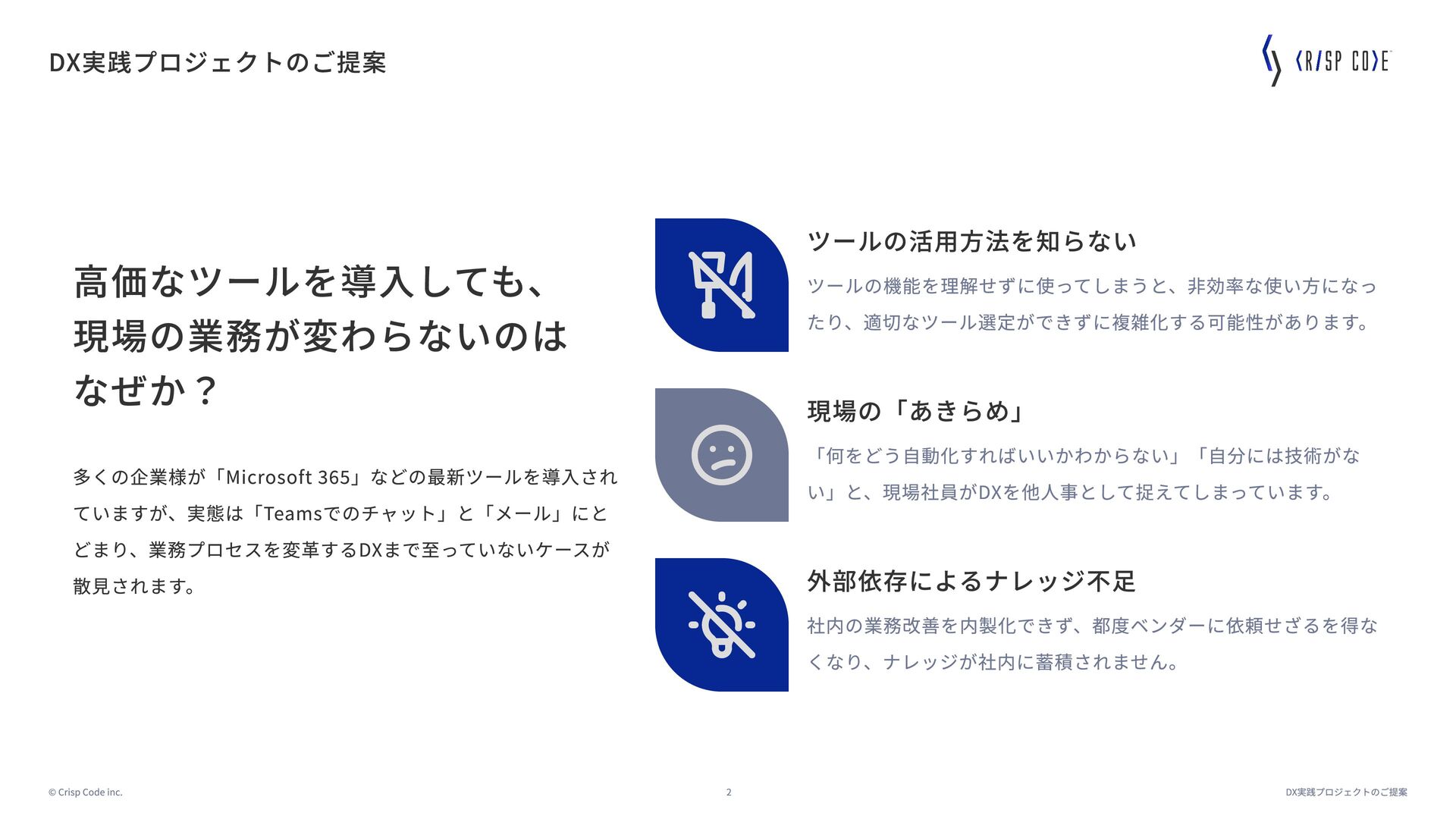 2. DX実践プロジェクトのご提案 © Crisp Code inc. 2 DX実践プロジェクトのご提案 高価なツールを導入しても、