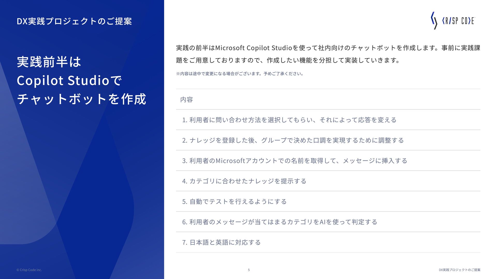 DX実践プロジェクトのご提案 内容 利用者に問い合わせ方法を選択してもらい、それによって応答を変える ナレッジを登録した後、グループで決めた口調を実現するために調整する 利用者のMicrosoftアカウントでの名前を取得して、メッセージに挿入する カテゴリに合わせたナレッジを提示する 自動でテストを行えるようにする 利用者のメッセージが当てはまるカテゴリをAIを使って判定する 日本語と英語に対応する 実践の前半はMicrosoft Copilot Studioを使って社内向けのチャットボットを作成します。事前に実践課 題をご用意しておりますので、作成したい機能を分担して実装していきます。 ※内容は途中で変更になる場合がございます。予めご了承ください。
