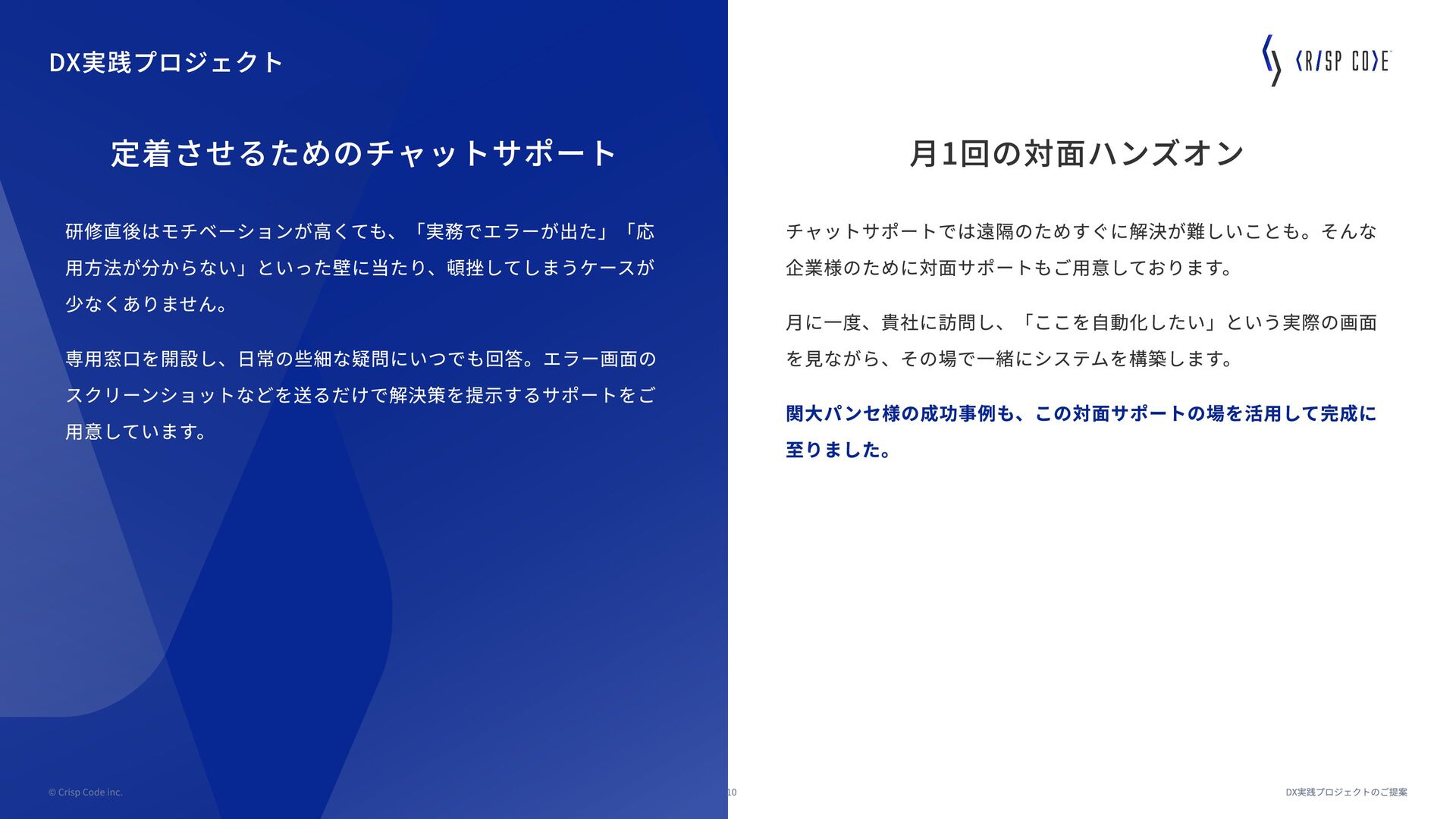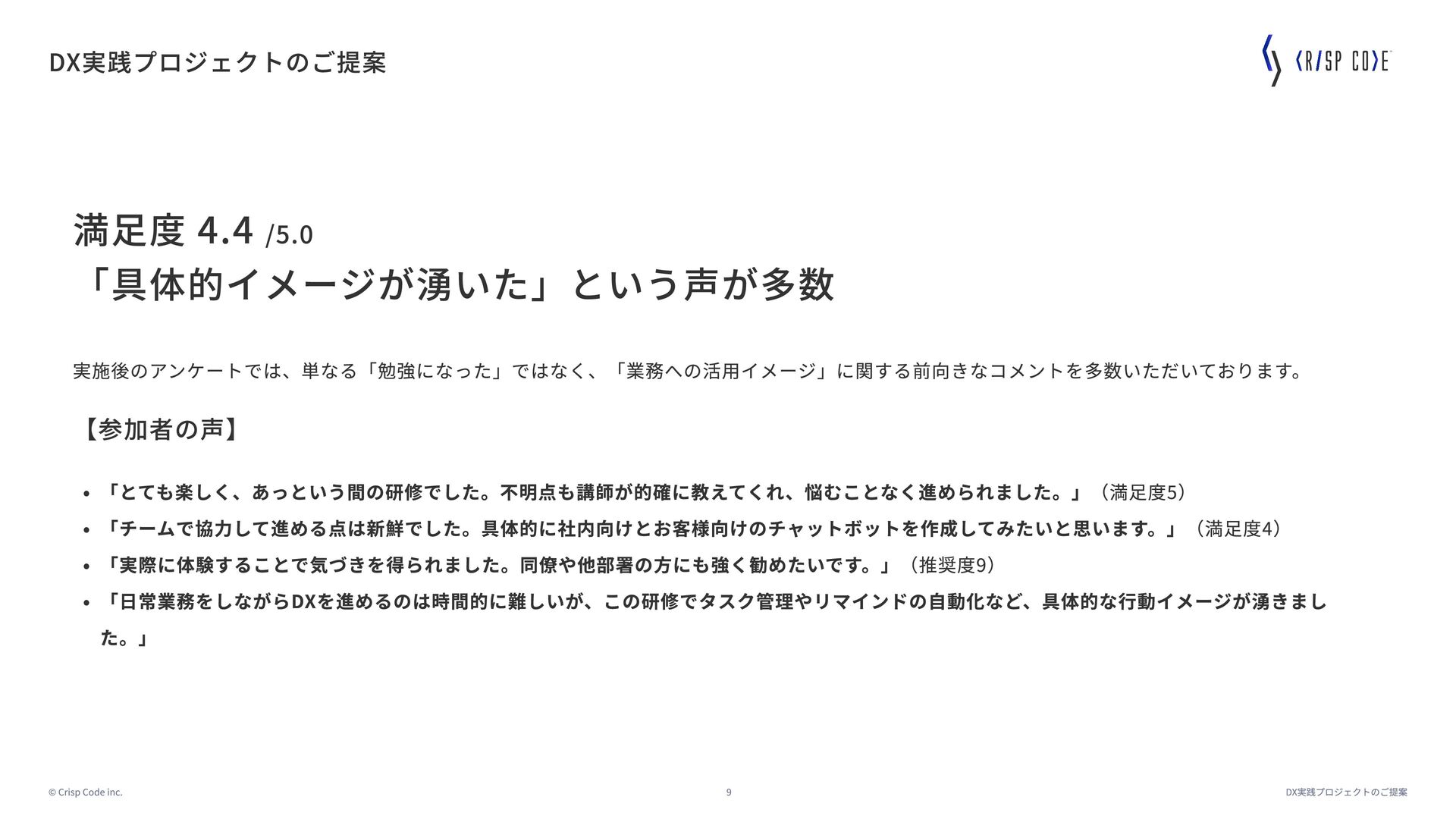 9. DX実践プロジェクトのご提案 © Crisp Code inc. 9 DX実践プロジェクトのご提案 満足度 4.4 /5.0