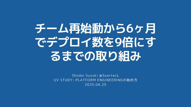 Shodai Suzuki @SoartecL UV STUDY: PLATFORM ENGINEERINGの始め方 2025.04.25 チーム再始動から6ヶ月 でデプロイ数を9倍にす