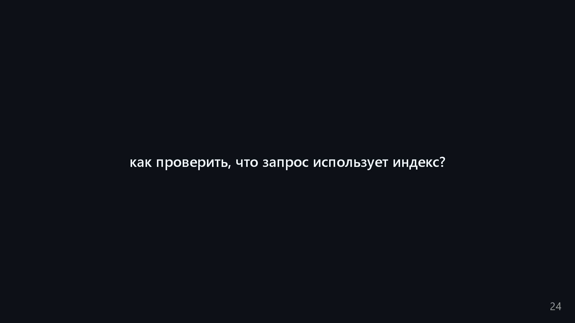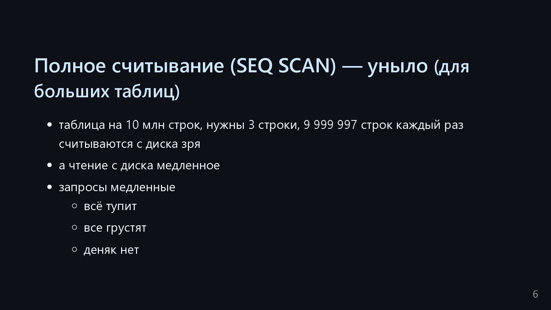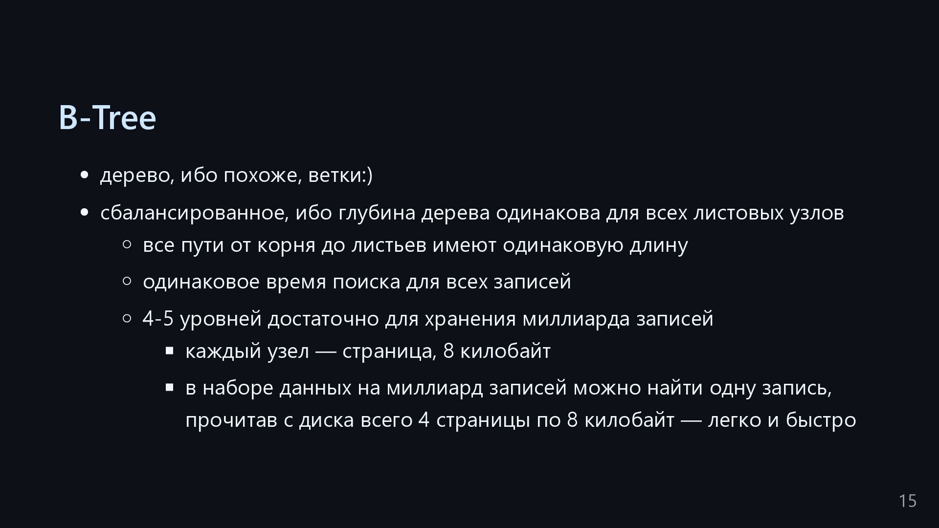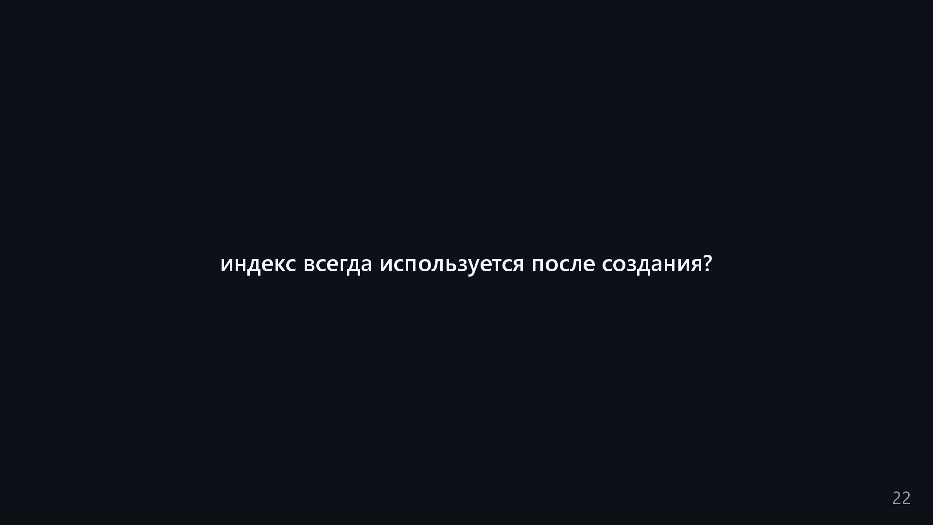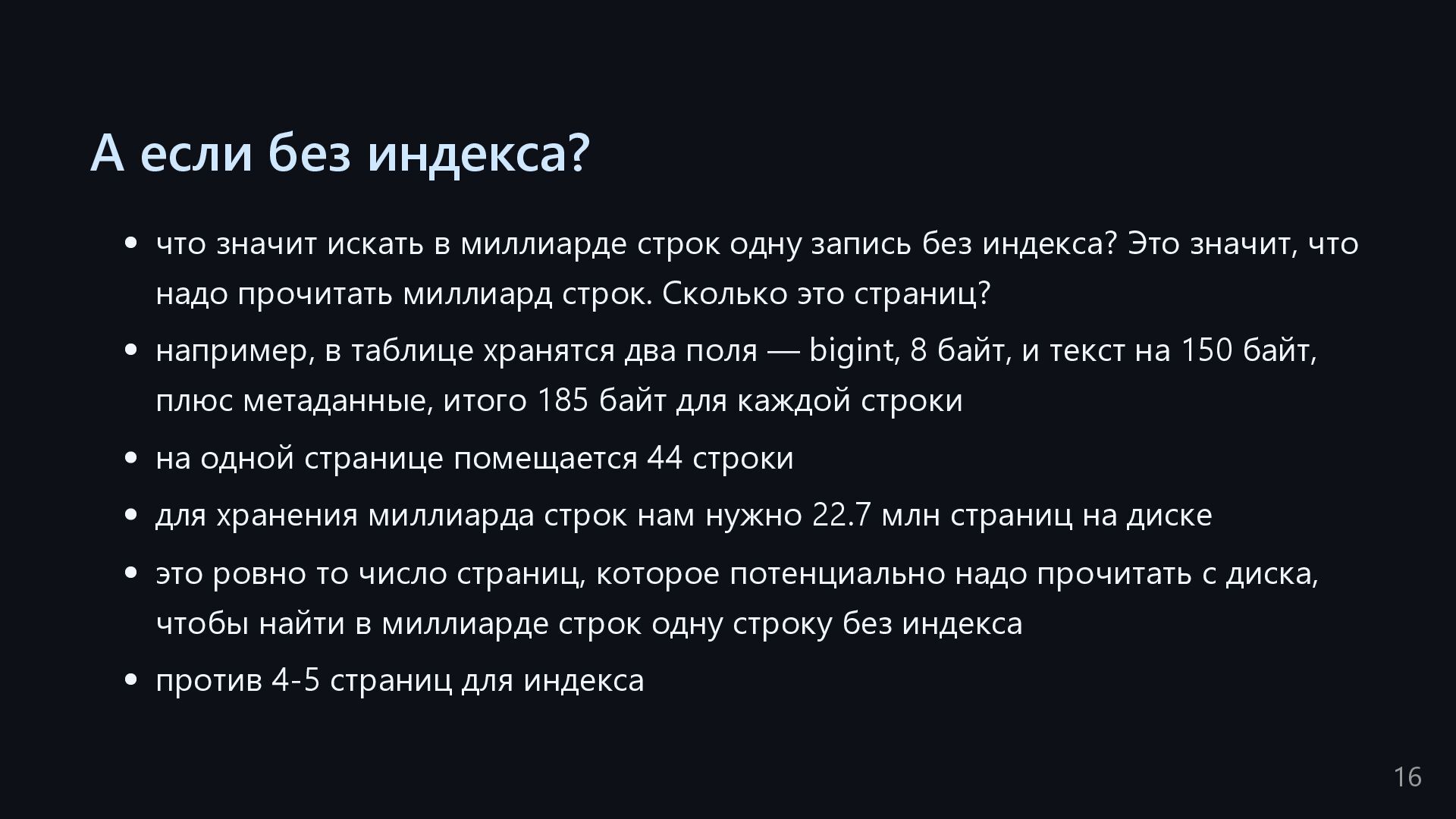 одну запись без индекса? Это значит, что надо прочитать миллиард строк. Сколько это страниц? например, в таблице хранятся два поля — bigint, 8 байт, и текст на 150 байт, плюс метаданные, итого 185 байт для каждой строки на одной странице помещается 44 строки для хранения миллиарда строк нам нужно 22.7 млн страниц на диске это ровно то число страниц, которое потенциально надо прочитать с диска, чтобы найти в миллиарде строк одну строку без индекса против 4-5 страниц для индекса 16