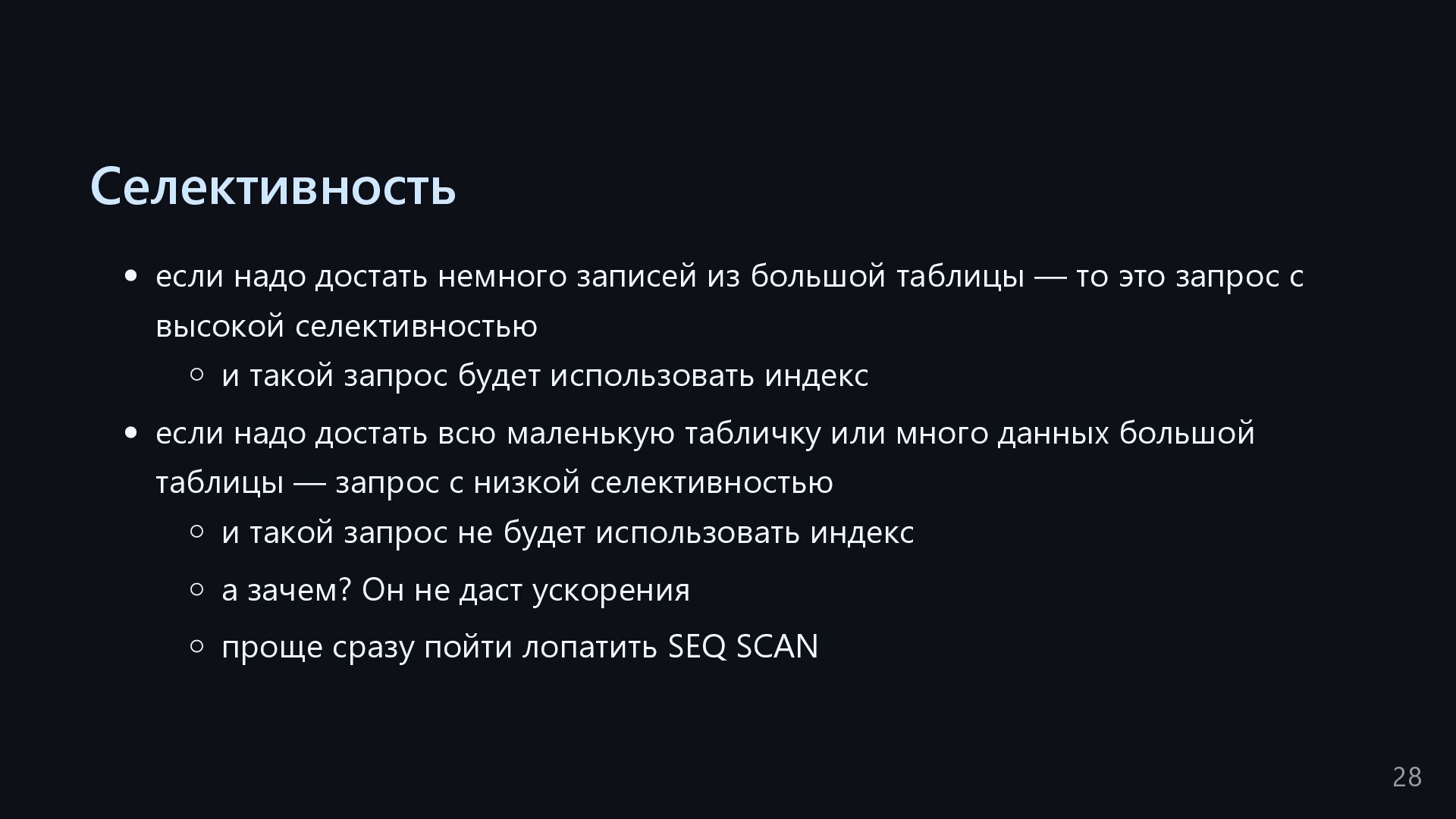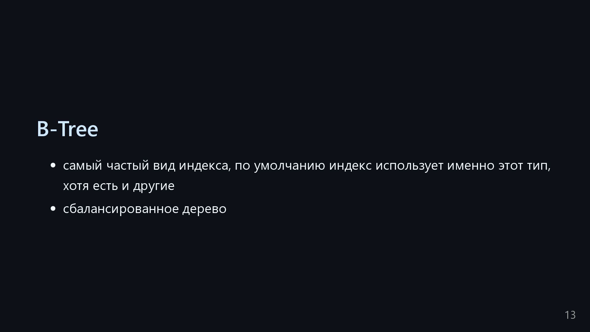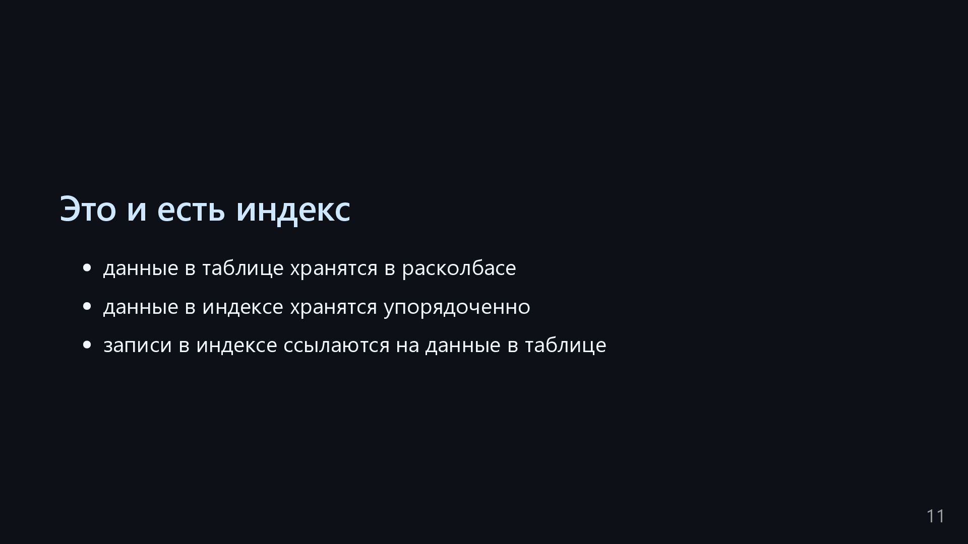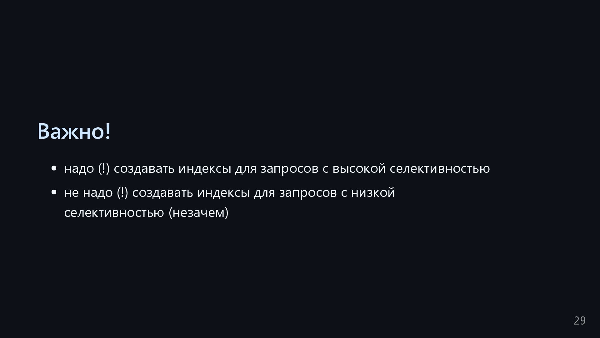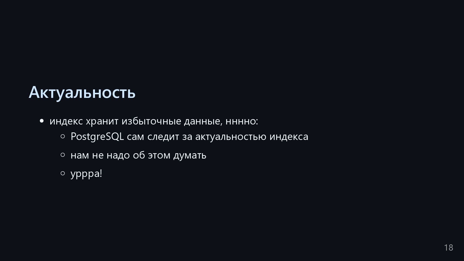 одну запись без индекса? Это значит, что надо прочитать миллиард строк. Сколько это страниц? например, в таблице хранятся два поля — bigint, 8 байт, и текст на 150 байт, плюс метаданные, итого 185 байт для каждой строки на одной странице помещается 44 строки для хранения миллиарда строк нам нужно 22.7 млн страниц на диске это ровно то число страниц, которое потенциально надо прочитать с диска, чтобы найти в миллиарде строк одну строку без индекса против 4-5 страниц для индекса 16