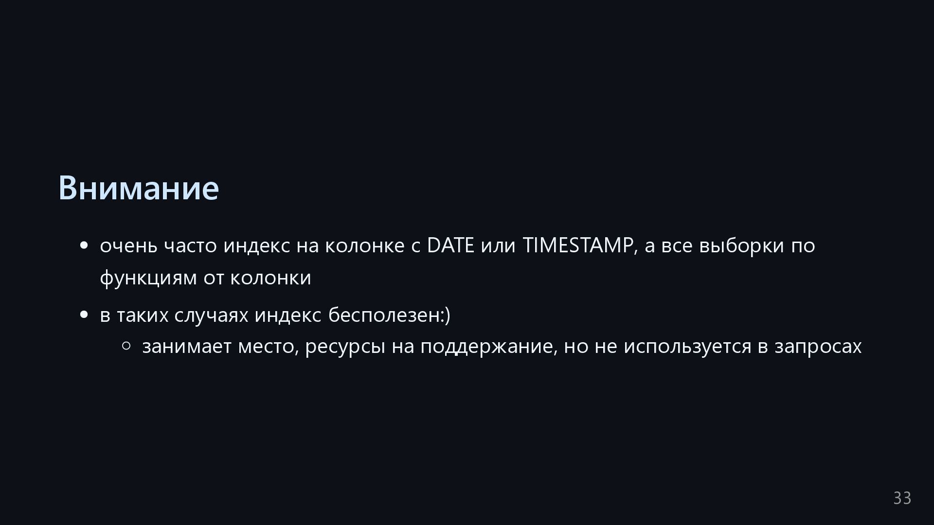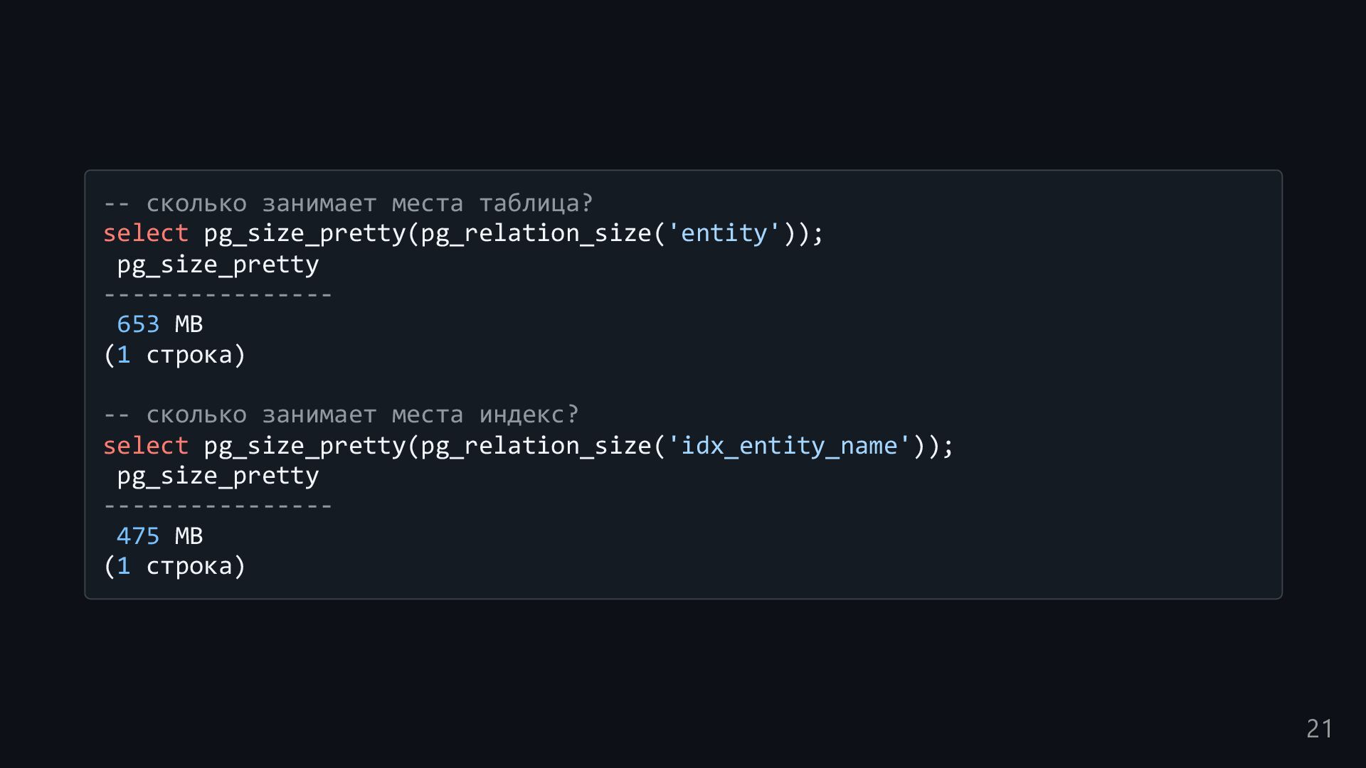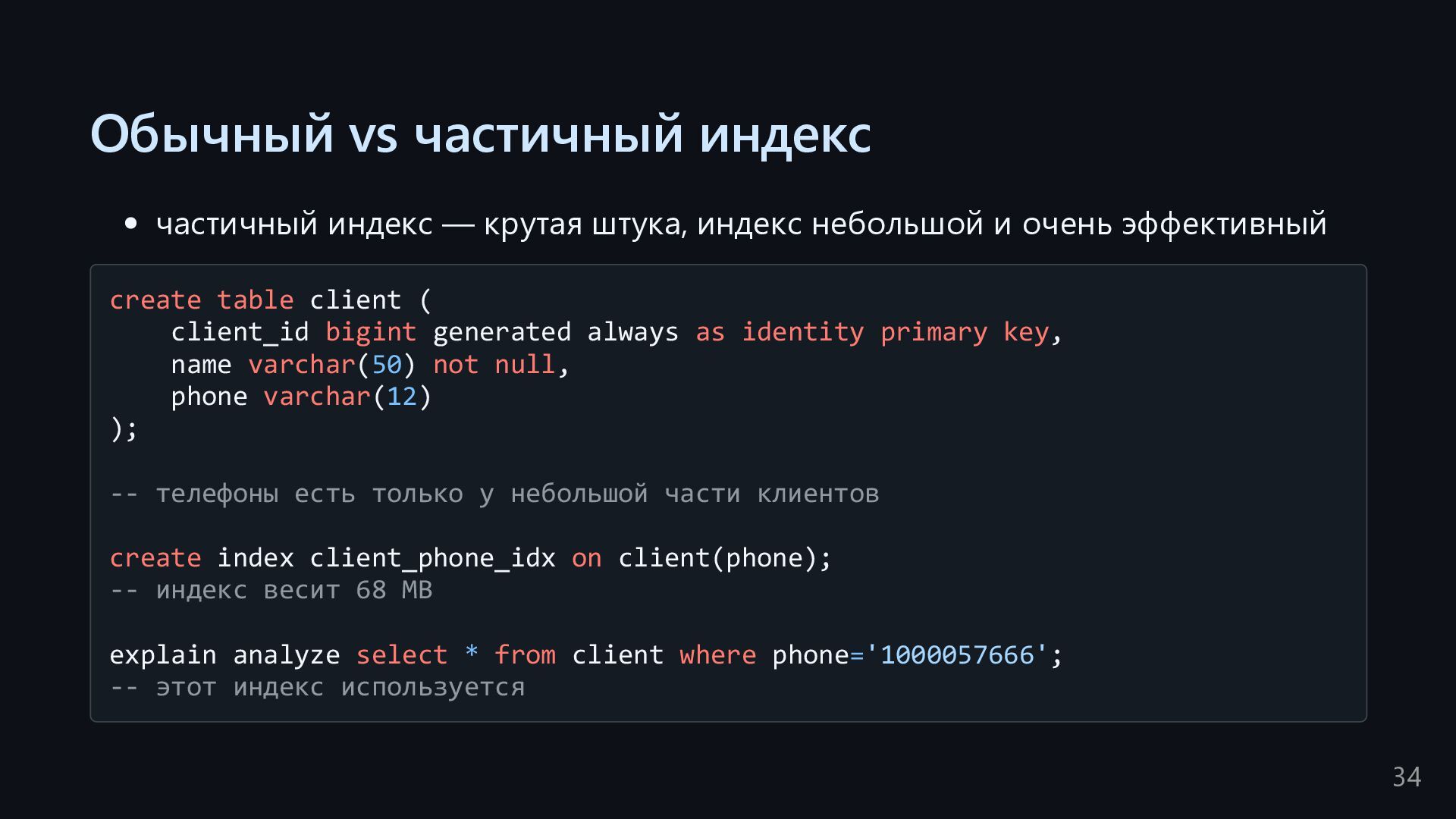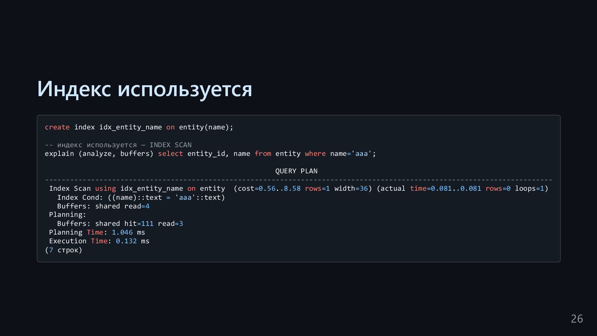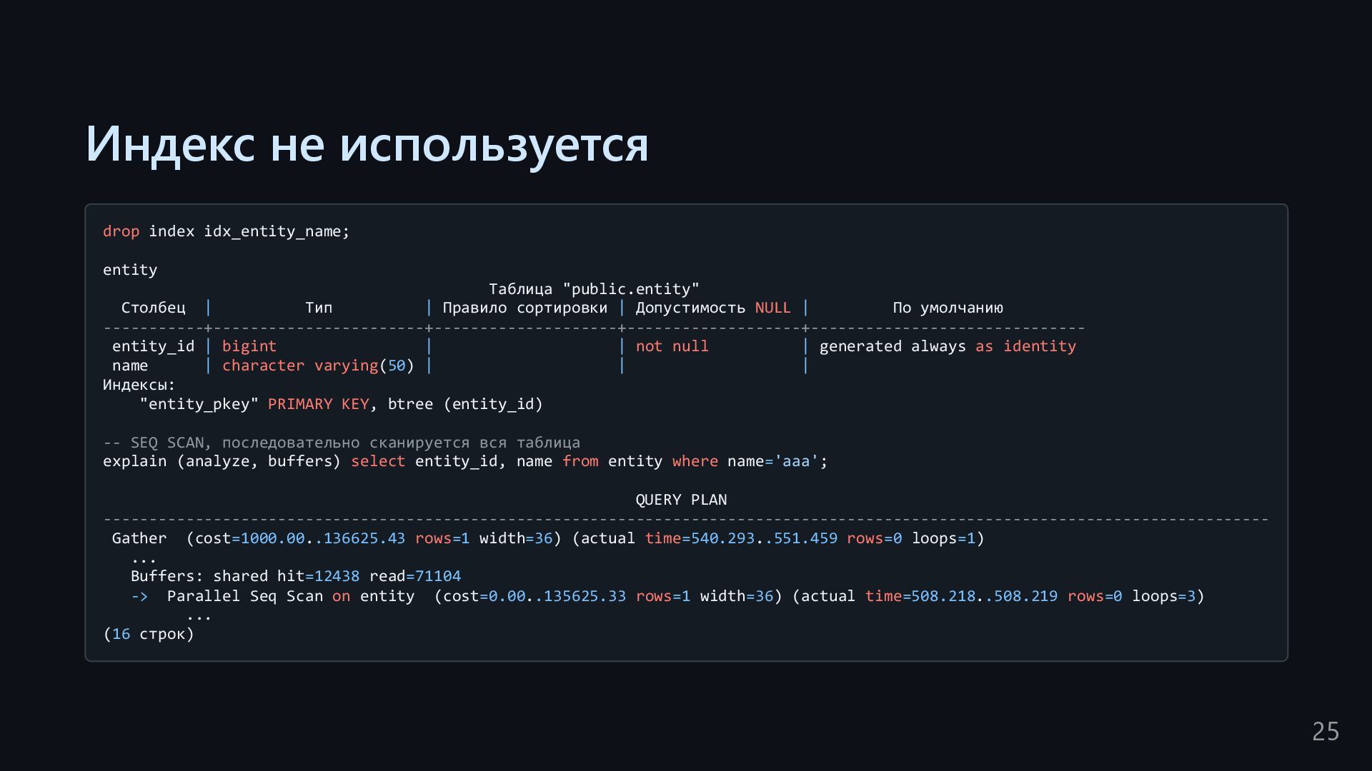 одну запись без индекса? Это значит, что надо прочитать миллиард строк. Сколько это страниц? например, в таблице хранятся два поля — bigint, 8 байт, и текст на 150 байт, плюс метаданные, итого 185 байт для каждой строки на одной странице помещается 44 строки для хранения миллиарда строк нам нужно 22.7 млн страниц на диске это ровно то число страниц, которое потенциально надо прочитать с диска, чтобы найти в миллиарде строк одну строку без индекса против 4-5 страниц для индекса 16