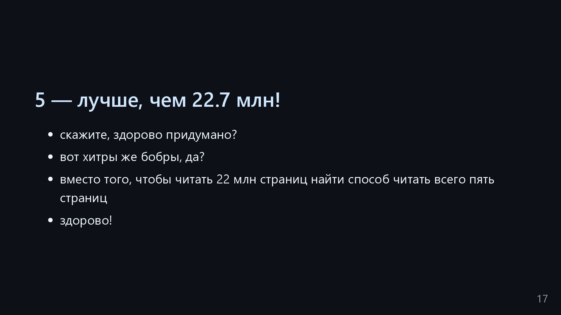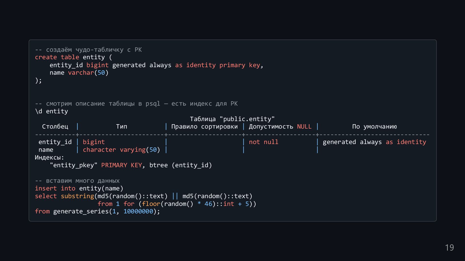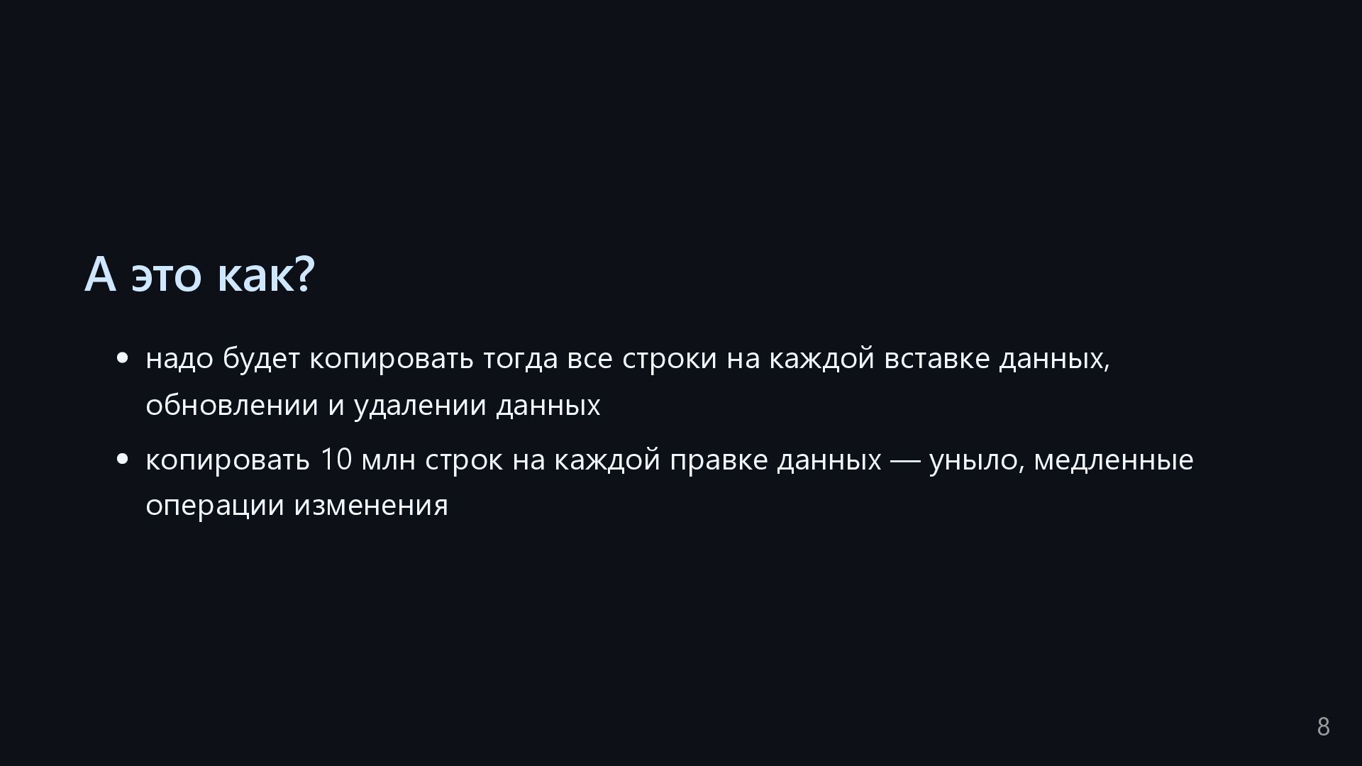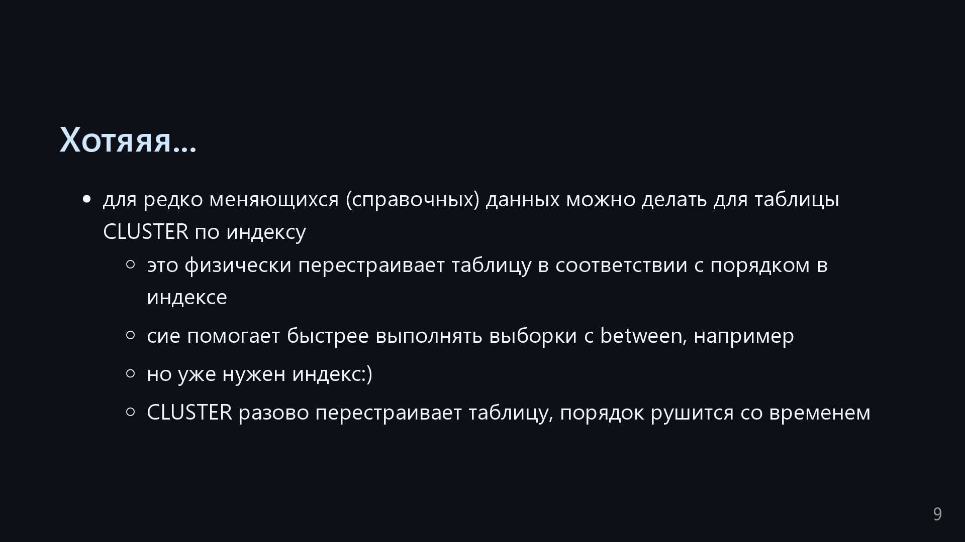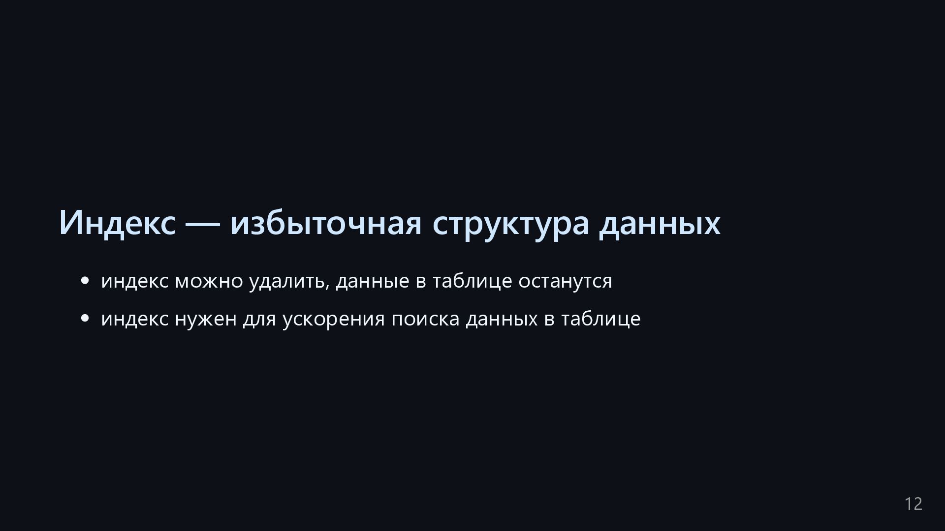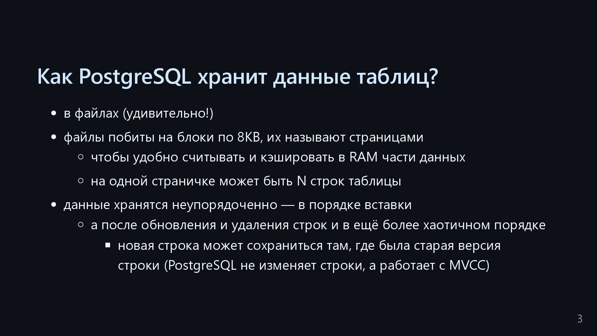 одну запись без индекса? Это значит, что надо прочитать миллиард строк. Сколько это страниц? например, в таблице хранятся два поля — bigint, 8 байт, и текст на 150 байт, плюс метаданные, итого 185 байт для каждой строки на одной странице помещается 44 строки для хранения миллиарда строк нам нужно 22.7 млн страниц на диске это ровно то число страниц, которое потенциально надо прочитать с диска, чтобы найти в миллиарде строк одну строку без индекса против 4-5 страниц для индекса 16