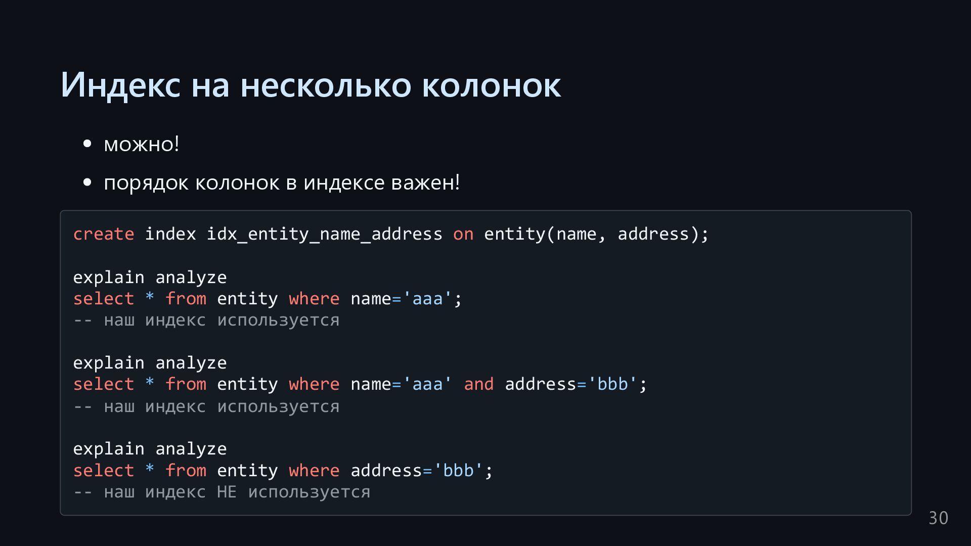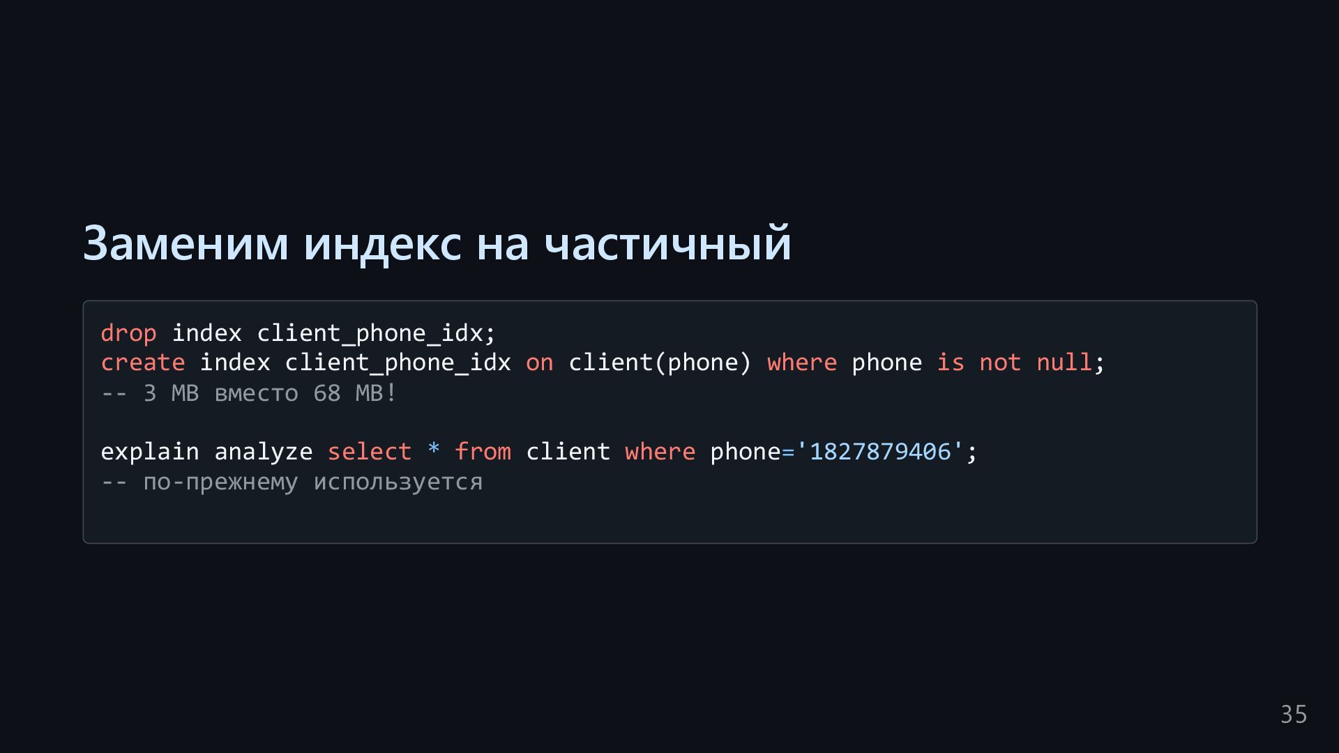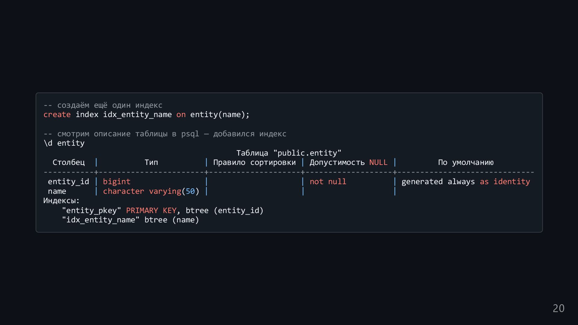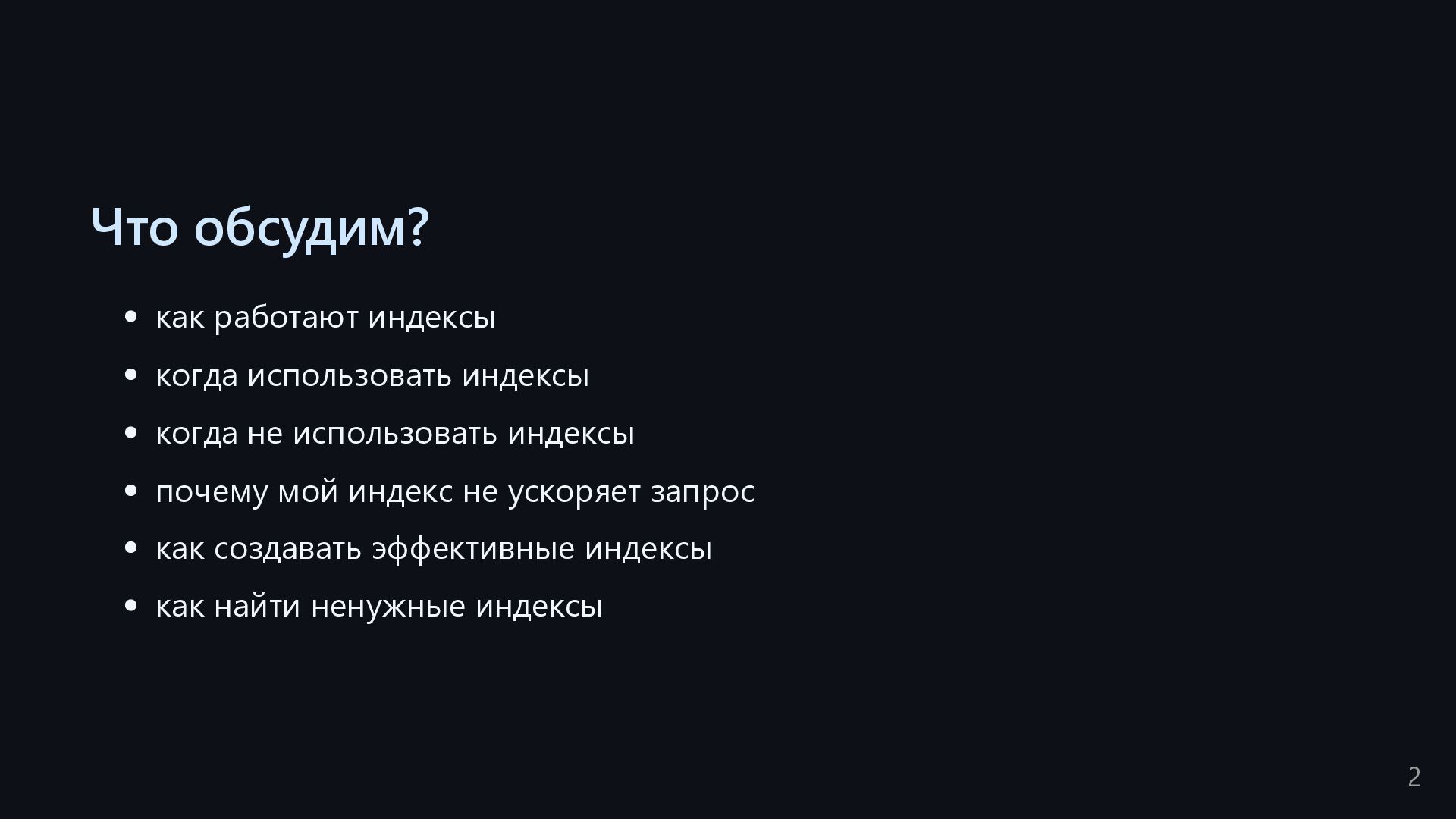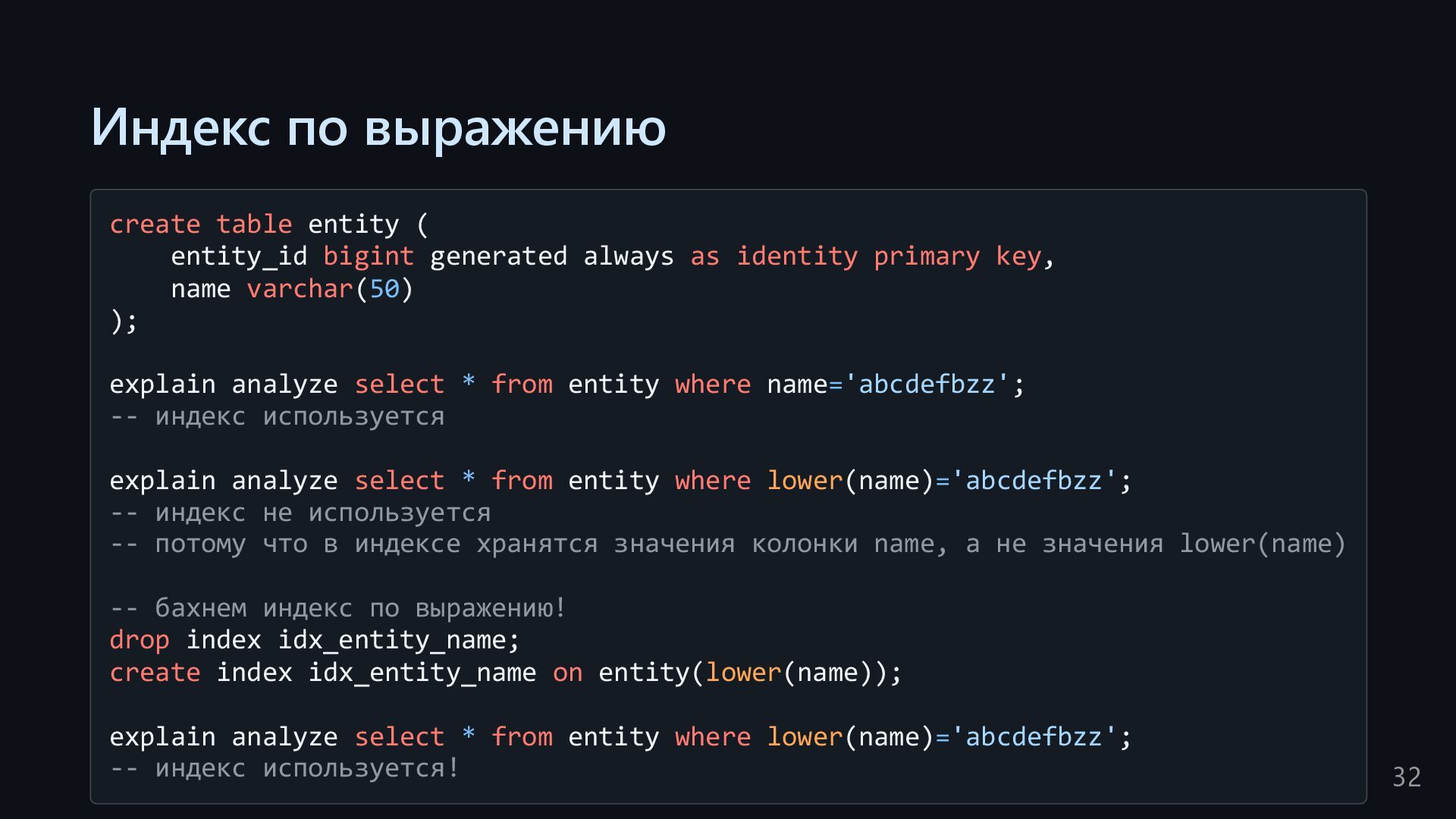 одну запись без индекса? Это значит, что надо прочитать миллиард строк. Сколько это страниц? например, в таблице хранятся два поля — bigint, 8 байт, и текст на 150 байт, плюс метаданные, итого 185 байт для каждой строки на одной странице помещается 44 строки для хранения миллиарда строк нам нужно 22.7 млн страниц на диске это ровно то число страниц, которое потенциально надо прочитать с диска, чтобы найти в миллиарде строк одну строку без индекса против 4-5 страниц для индекса 16