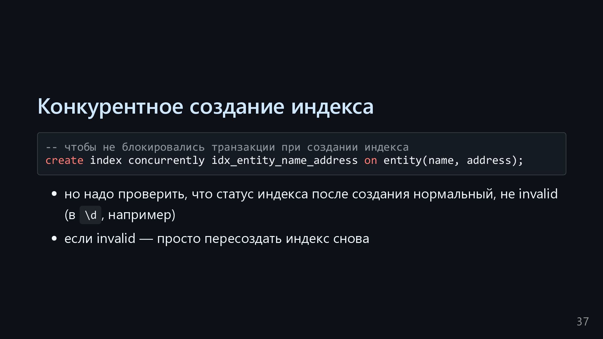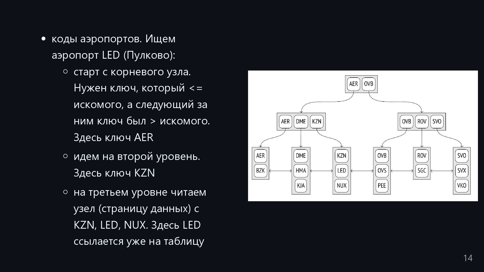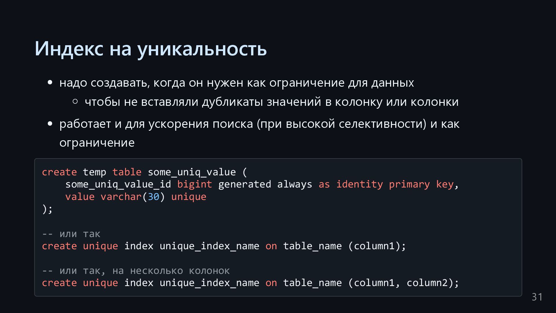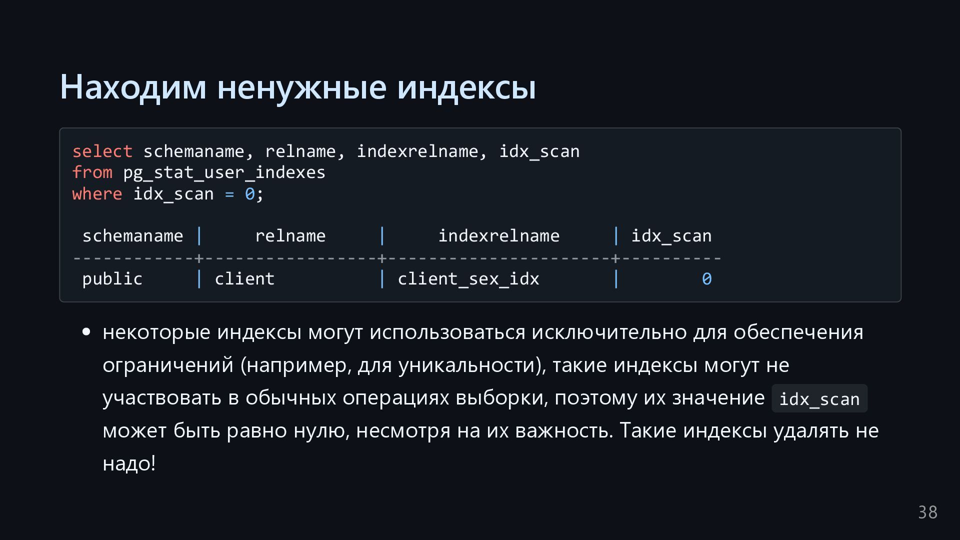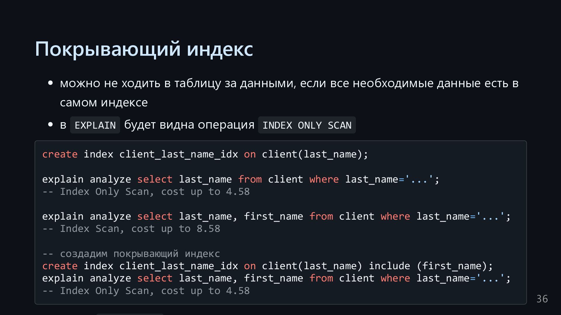 одну запись без индекса? Это значит, что надо прочитать миллиард строк. Сколько это страниц? например, в таблице хранятся два поля — bigint, 8 байт, и текст на 150 байт, плюс метаданные, итого 185 байт для каждой строки на одной странице помещается 44 строки для хранения миллиарда строк нам нужно 22.7 млн страниц на диске это ровно то число страниц, которое потенциально надо прочитать с диска, чтобы найти в миллиарде строк одну строку без индекса против 4-5 страниц для индекса 16