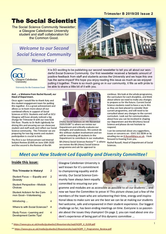 some capacity with the Students’ Association since I started at GCU in my first year. I first became involved in vol- unteering activities when I met welcoming students’ at Freshers Fayre when I started in September 2016. I started as a contributor for our Student Magazine The EDIT, more so for the fashion section, progressing finally to becoming Editor in Chief in my third year. It’s a role I have continued with through my fourth and final year. I have met so many friends for life and it has helped me grow into the out- going bubbly person that I am right now. It also allowed me to want to get involved with other volunteering opportunities that were open to me. In my second year I was class rep for my year and I am again this year, I wanted to go for this role as I wanted to represent my fellow classmates and ensure that if something was wrong that it would be rectified. . I have also progressed to becoming the department rep for Social Sciences. Department Reps exist to support the work of Class Representatives and build links between them, their wider School and the Students' Association. I enjoy having the opportunity to help improve the learning experience for myself and my fellow students. I became heavily involved with societies at the end of my second year after helping with Eilidh Fulton campaign for Full Time Officer. We started up new societies and I became even more aware of the different societies and how important they are to a students’ experi- ence. This led me to being responsible for Faith and Culture Socie- ties when sitting on Societies Council. This year I have become the Head of Political, Social and Hobby Societies. I absolutely love my role and the skills that I have learned whilst being on societies council for the past two years. I have learned when to coach and when to mentor, as well as learning about different cultures and religions, as well as assisting with the strategic operations of societies. At present we currently have 2414 society members, with 72 societies overall. This year I have taken on roles within The Student Solidarity Network, The Circle Society GCU and the newly formed Social Sciences Society. The Student Solidarity Network is a society which provides knowledge about trade unionism and we also provide solidarity to university staff who are taking industrial action – you may have seen us on the picket line during the 14 day strike period. The Circle Socie- ty GCU, on the otherhand, is a collective within Chancellor Annie Lennox’s organisation, ‘The Circle’. We bring together students from all walks of life at Glasgow Caledonian University, who have a shared passion and commitment to addressing the issues facing marginal- ised and disempowered women and girls across the globe. I have also been part of the founding team for a Social Sciences Society and we aim to have an event to allow students and staff to come togeth- er before the end of the trimester. Keep an eye out for info! One of the best roles I had this year was being one of the Ethical and Environmental Officers. We had a swap shop back in December and we have a Sustainability Fair planned for the 25th of March with some external parties also attending. We worked with GCU Wellbe- ing Team to coordinate a plant giveaway during Go Green Week and it was super successful! We hope that it can happen again in the future. Volunteering whilst at university has been great for me as it has helped me to come out of my shell whilst encouraging me to be who I am and not change myself for anyone. Volunteering at university helps build confidence skills and allows you to meet new people, building friendships for life. It also gives you great experience and is something else to put on your cv which will help you in the future when it comes to seeking employment. Societies and liberation groups allow you to experience the social sciences in real life. I encourage everyone to get involved with societies, sports clubs, liberation groups, student medias and representation groups. I promise you will not regret it! You can find out more about sports clubs, societies, liberation and representation groups as well as both student media groups by visiting- www.gcustudents.co.uk. The end of second year can bring about a sense of anxiety for many social science students as, faced with choosing your modules for 3rd year, you are forced to begin questioning your future career path and, there- fore, what pathway your degree should follow. Discipline specialism begins with module choices. First and second year gives you a great insight into the different subjects that the Social Sciences have to offer wheth- er it be Politics, History, Criminology, Sociology or Economics. More details on how to pick your modules and what the choices are will be released in the months to the follow so keep an eye out – make sure you check your e-mails regularly! Things that I found useful to bear in mind when I was making my module choices: It’s important to consider your ideal job or the field you aim to work in, and what skills each special- ism would provide you with for the future – if you need help with this check out the careers service. If you’re not interested in a module it can lead to a lack of work ethic and studying can feel like a chore. So, go with what you’re interested in or a subject you enjoyed in first and second year. Don’t just pick a module because your friends are taking it. Remember it’s your future and your ex- periences and module choices could affect the types of jobs you are able to apply for If you’re not sure about what to pick, speak to the staff running the modules or even students from the years above. They will be more than happy to provide you with more information. It can be a stressful period so make sure you do your research to make the best choice for you. Personally, I am very happy with the choices I selected at the end of 2nd year. I would really like to do so