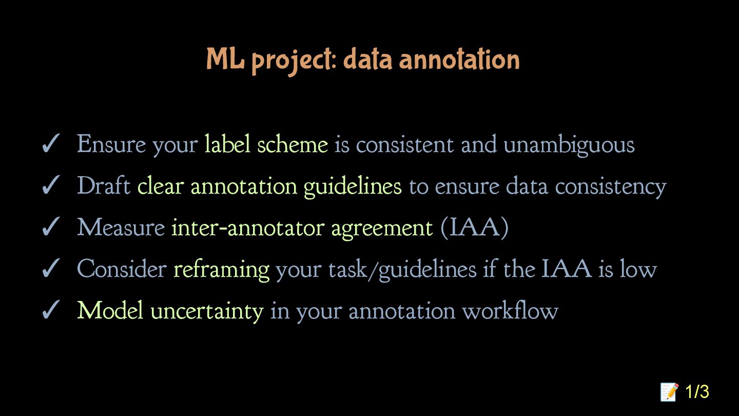 consistent and unambiguous ✓ Draft clear annotation guidelines to ensure data consistency ✓ Measure inter-annotator agreement (IAA) ✓ Consider reframing your task/guidelines if the IAA is low ✓ Model uncertainty in your annotation workflow 📝 1/3