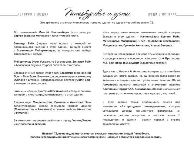 72. Вот знаменитый Моисей Наппельбаум фотографирует Сергея Есенина, молодого и талантливого поэта. Зинаида Райх (первая жена поэта), с которой он познакомился именно в этом здании, танцует вместе с Всеволодом Мейерхольдом, за которого она выйдет впоследствии замуж. Мейерхольд будет буквально боготворить Зинаиду Райх и благодаря ему она откроет свой талант актрисы. Следом за ними знаменитое трио: Владимир Маяковский, Осип и Лиля Брик. Возможно, поэт декламирует свою поэму «Облако в штанах», которая вызвала восторг у Лили Брик в момент их знакомства. За ними мы видим Дмитрия Шостаковича, который работал тапером в кинотеатре, находившемся в этом здании. Следом идут Мандельштам, Гумилев и Ахматова. Этих талантливейших людей связывала крепкая дружба (Мандельштам и Ахматова) и пылкая любовь (Ахматова и Гумилев). За ними стоят народные любимцы - певец Леонид Утесов и актриса Рина Зеленая. Итак, перед нами плеяда знаменитых людей, которые бывали в этом здании - Наппельбаум, Есенин, Райх, Мейерхольд, Маяковский, Осип и Лиля Брик, Шостакович, Мандельштам, Гумилёв, Ахматова, Утесов, Зеленая. Интересно, что в разные времена этим зданием обладали и распоряжались в основном женщины (Н.А Протасова, М.В. Военкова, Н.Ф. Мулерт (владелица театра)). Здесь часто бывала А. Ахматова, которая, хоть и не была владелицей этого здания, но, однозначно была одной из значимых и видных дам на проводимых вечерах. Образ Ахматовой является отсылкой к знаменитой картине Альтмана «Портрет А.А. Ахматовой». Желтая шаль и синее платье на арт-панно намекают на сходство с картиной. В этом здании также проводились вечера под названием «Литературные понедельники», которые устраивали дочери знаменитого фотографа. Их посещали деятели искусства и светская элита. В последствии в здании возник первый в стране звуковой кинотеатр. Невский 72, по праву, является местом силы для творческих людей Петербурга. Колесо истории нам принесет еще много громких имен, которые останутся с городом навсегда!.. Петербургские силуэты И с т о р и я в л ю д я х Л ю д и в и с т о р и и