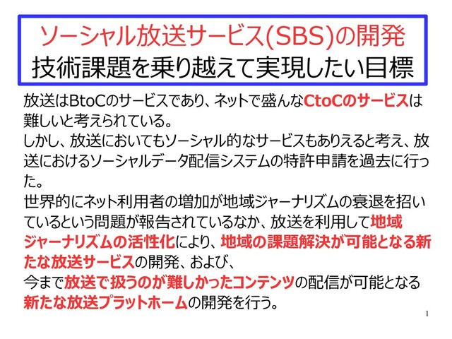 1 ソーシャル放送サービス(SBS)の開発 技術課題を乗り越えて実現したい目標 放送はBtoCのサービスであり、ネットで盛んなCtoCのサービスは 難しいと考えられている。 しかし、放送においてもソーシャル的なサービスもありえると考え、放 送におけるソーシャルデータ配信システムの特許申請を過去に行っ た。 世界的にネット利用者の増加が地域ジャーナリズムの衰退を招い ているという問題が報告されているなか、放送を利用して地域