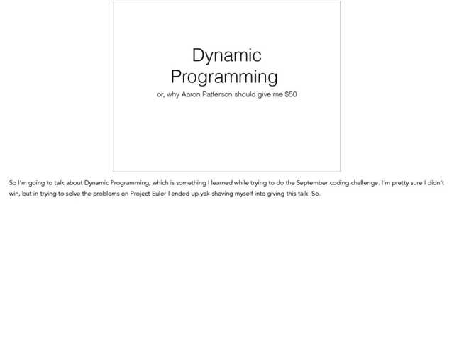 So I’m going to talk about Dynamic Programming, which is something I learned while trying to do the September coding challenge. I’m pretty sure I didn’t win, but in trying to solve the problems on Project Euler I ended up yak-shaving myself into giving this talk. So.