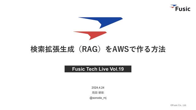 ©Fusic Co., Ltd. 1 検索拡張⽣成(RAG)をAWSで作る⽅法 2024.4.24 苑⽥ 朝彰 @sonoda_mj Fusic
