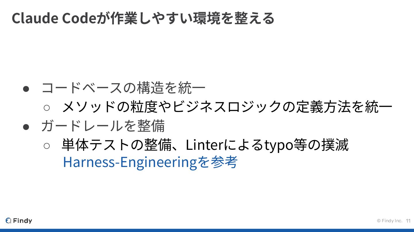 © Findy Inc. Claude Codeが作業しやすい環境を整える 11 • コードベースの構造を統⼀ ◦ メソッドの粒度やビジネスロジックの定義⽅法を統⼀