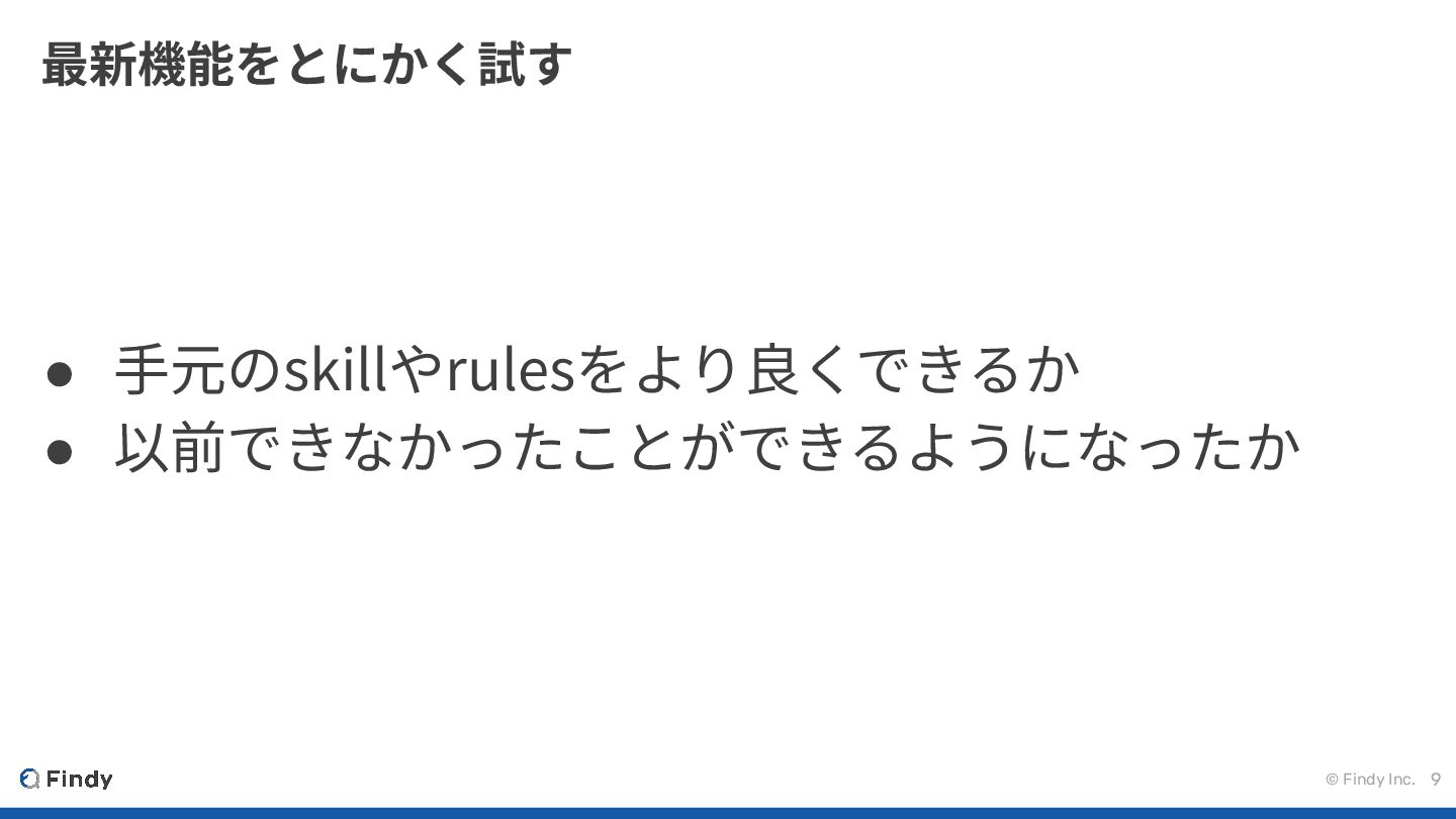 © Findy Inc. 最新機能をとにかく試す 9 • ⼿元のskillやrulesをより良くできるか • 以前できなかったことができるようになったか
