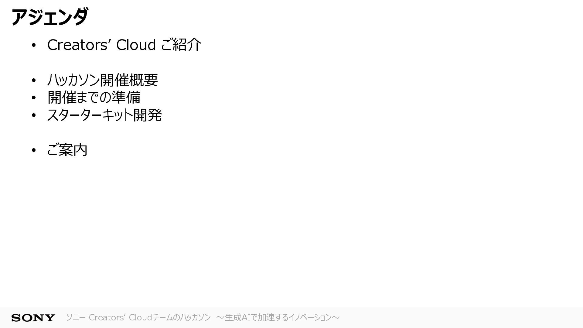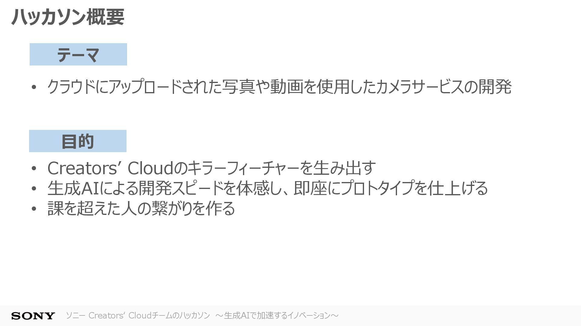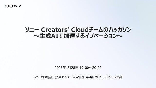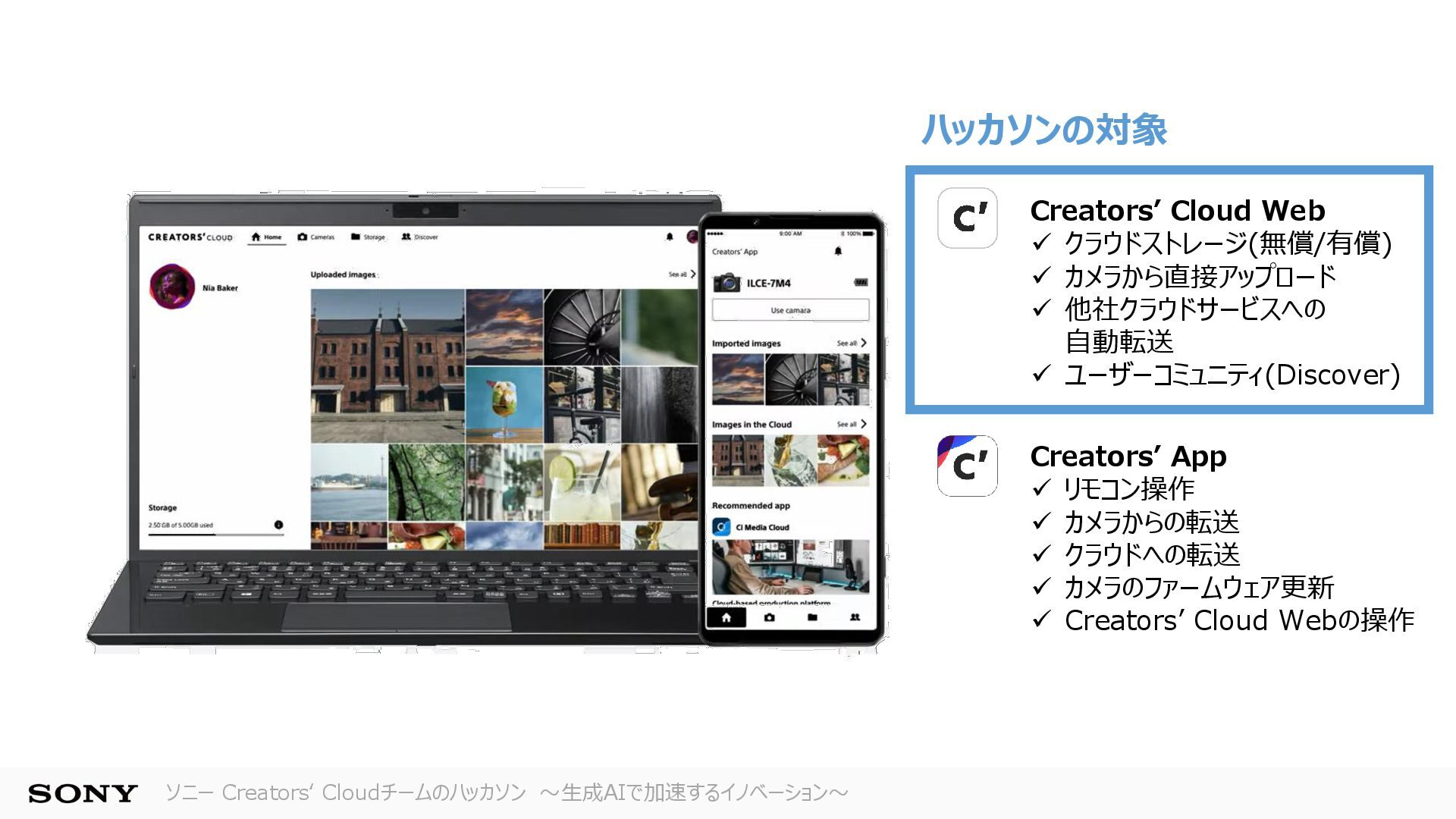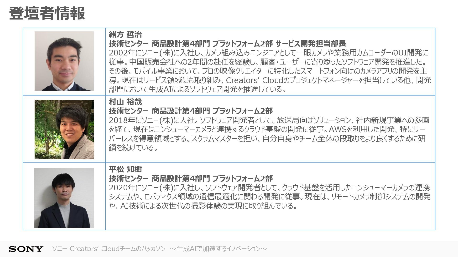 サービス開発担当部長 2002年にソニー(株)に入社し、カメラ組み込みエンジニアとして一眼カメラや業務用カムコーダーのUI開発に 従事。中国販売会社への2年間の赴任を経験し、顧客・ユーザーに寄り添ったソフトウェア開発を推進した。 その後、モバイル事業において、プロの映像クリエイターに特化したスマートフォン向けのカメラアプリの開発を主 導。現在はサービス領域にも取り組み、Creators‘ Cloudのプロジェクトマネージャーを担当している他、開発 部門において生成AIによるソフトウェア開発を推進している。 村山 裕哉 技術センター 商品設計第4部門 プラットフォーム2部 2018年にソニー(株)に入社。ソフトウェア開発者として、放送局向けソリューション、社内新規事業への参画 を経て、現在はコンシューマーカメラと連携するクラウド基盤の開発に従事。AWSを利用した開発、特にサー バーレスを得意領域とする。スクラムマスターを担い、自分自身やチーム全体の段取りをより良くするために研 鑽を続けている。 平松 知樹 技術センター 商品設計第4部門 プラットフォーム2部 2020年にソニー(株)に入社し、ソフトウェア開発者として、クラウド基盤を活用したコンシューマーカメラの連携 システムや、ロボティクス領域の通信最適化に関わる開発に従事。現在は、リモートカメラ制御システムの開発 や、AI技術による次世代の撮影体験の実現に取り組んでいる。