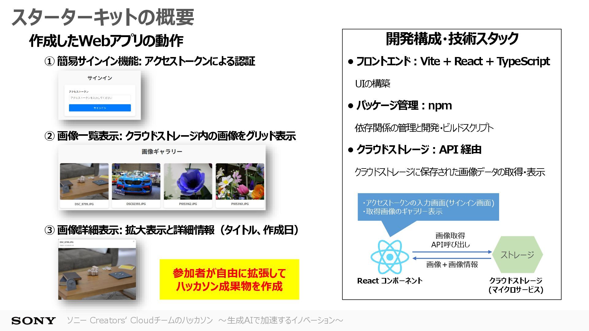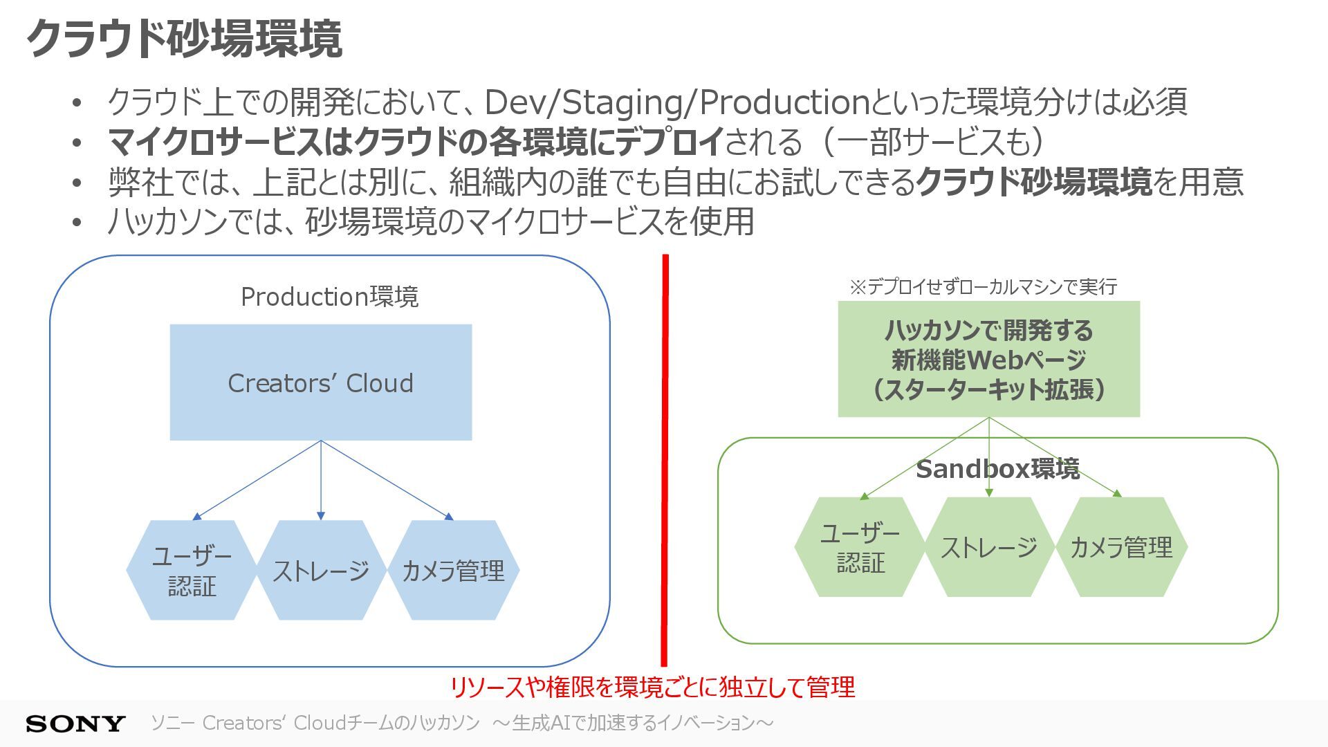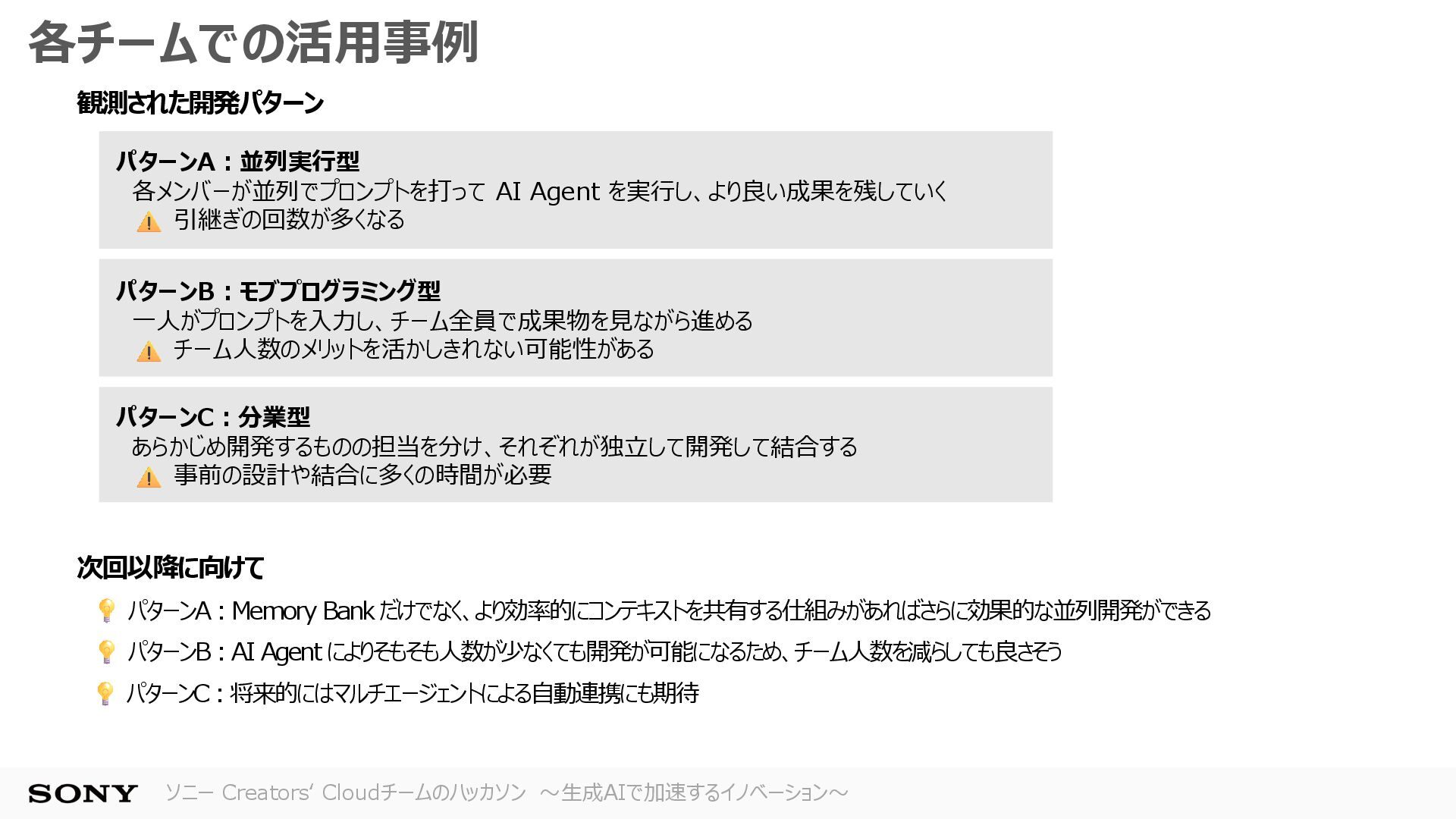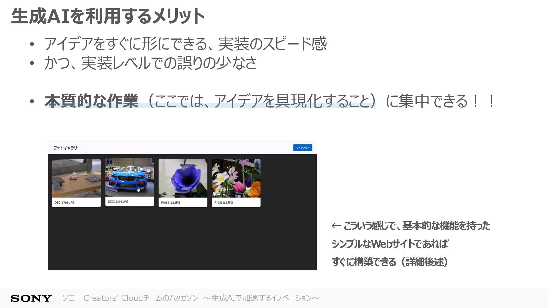 サービス開発担当部長 2002年にソニー(株)に入社し、カメラ組み込みエンジニアとして一眼カメラや業務用カムコーダーのUI開発に 従事。中国販売会社への2年間の赴任を経験し、顧客・ユーザーに寄り添ったソフトウェア開発を推進した。 その後、モバイル事業において、プロの映像クリエイターに特化したスマートフォン向けのカメラアプリの開発を主 導。現在はサービス領域にも取り組み、Creators‘ Cloudのプロジェクトマネージャーを担当している他、開発 部門において生成AIによるソフトウェア開発を推進している。 村山 裕哉 技術センター 商品設計第4部門 プラットフォーム2部 2018年にソニー(株)に入社。ソフトウェア開発者として、放送局向けソリューション、社内新規事業への参画 を経て、現在はコンシューマーカメラと連携するクラウド基盤の開発に従事。AWSを利用した開発、特にサー バーレスを得意領域とする。スクラムマスターを担い、自分自身やチーム全体の段取りをより良くするために研 鑽を続けている。 平松 知樹 技術センター 商品設計第4部門 プラットフォーム2部 2020年にソニー(株)に入社し、ソフトウェア開発者として、クラウド基盤を活用したコンシューマーカメラの連携 システムや、ロボティクス領域の通信最適化に関わる開発に従事。現在は、リモートカメラ制御システムの開発 や、AI技術による次世代の撮影体験の実現に取り組んでいる。