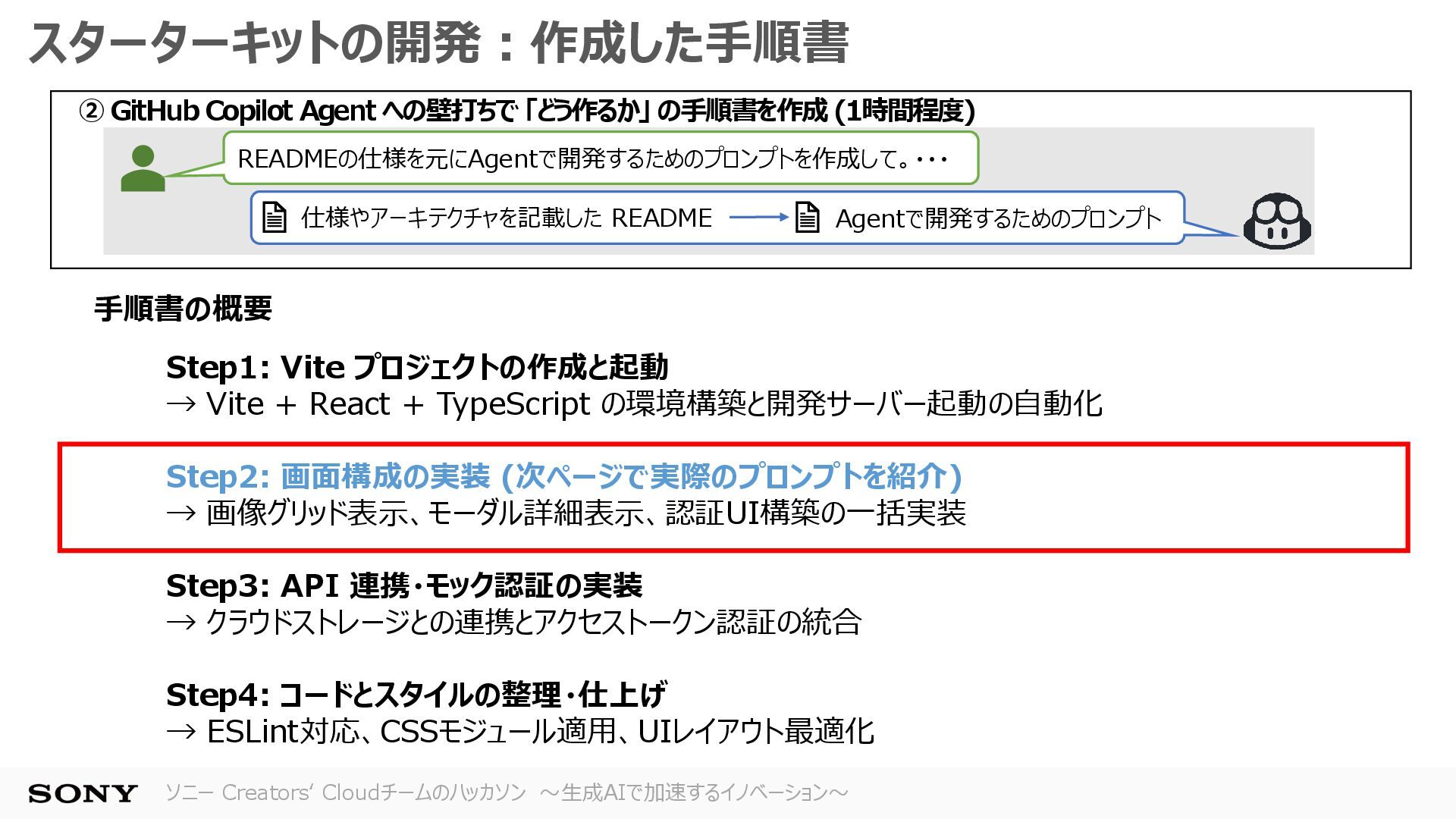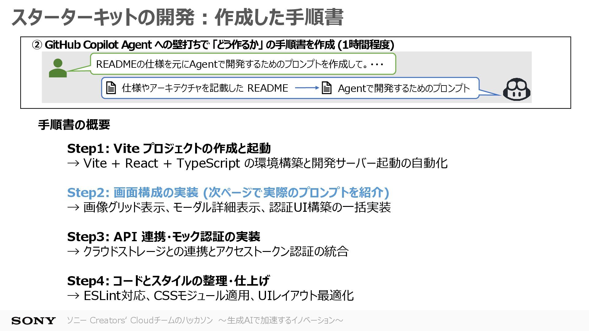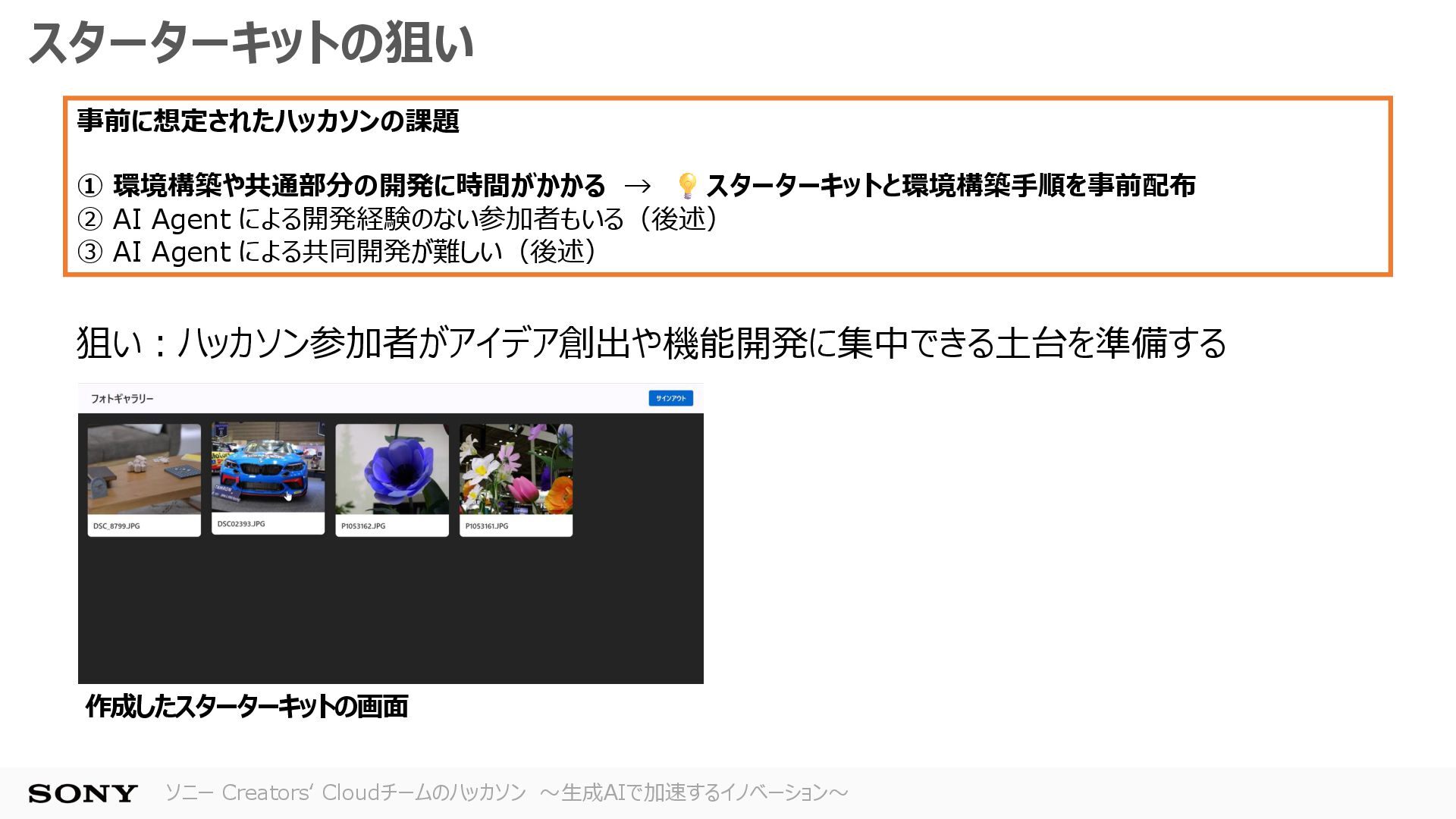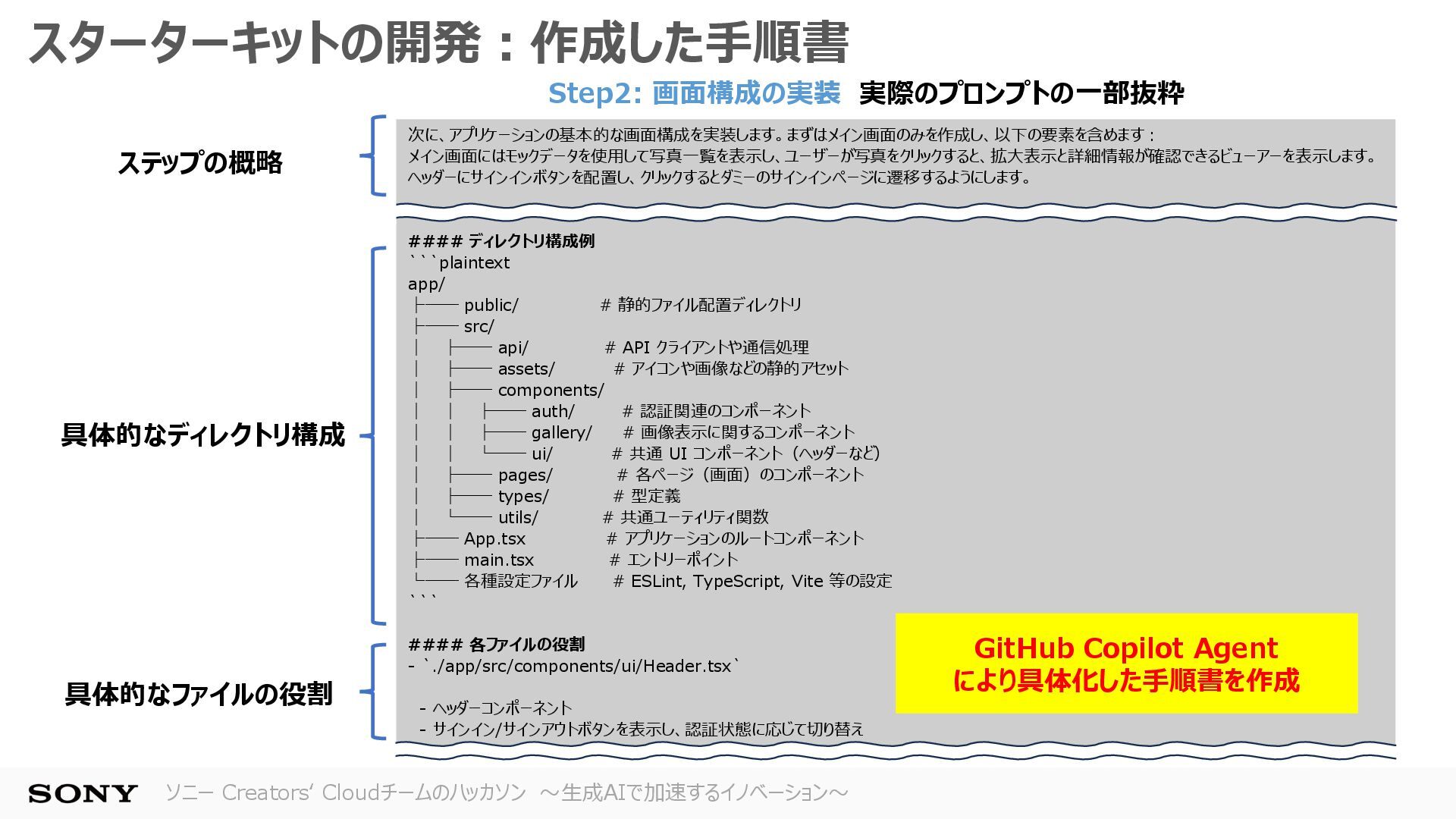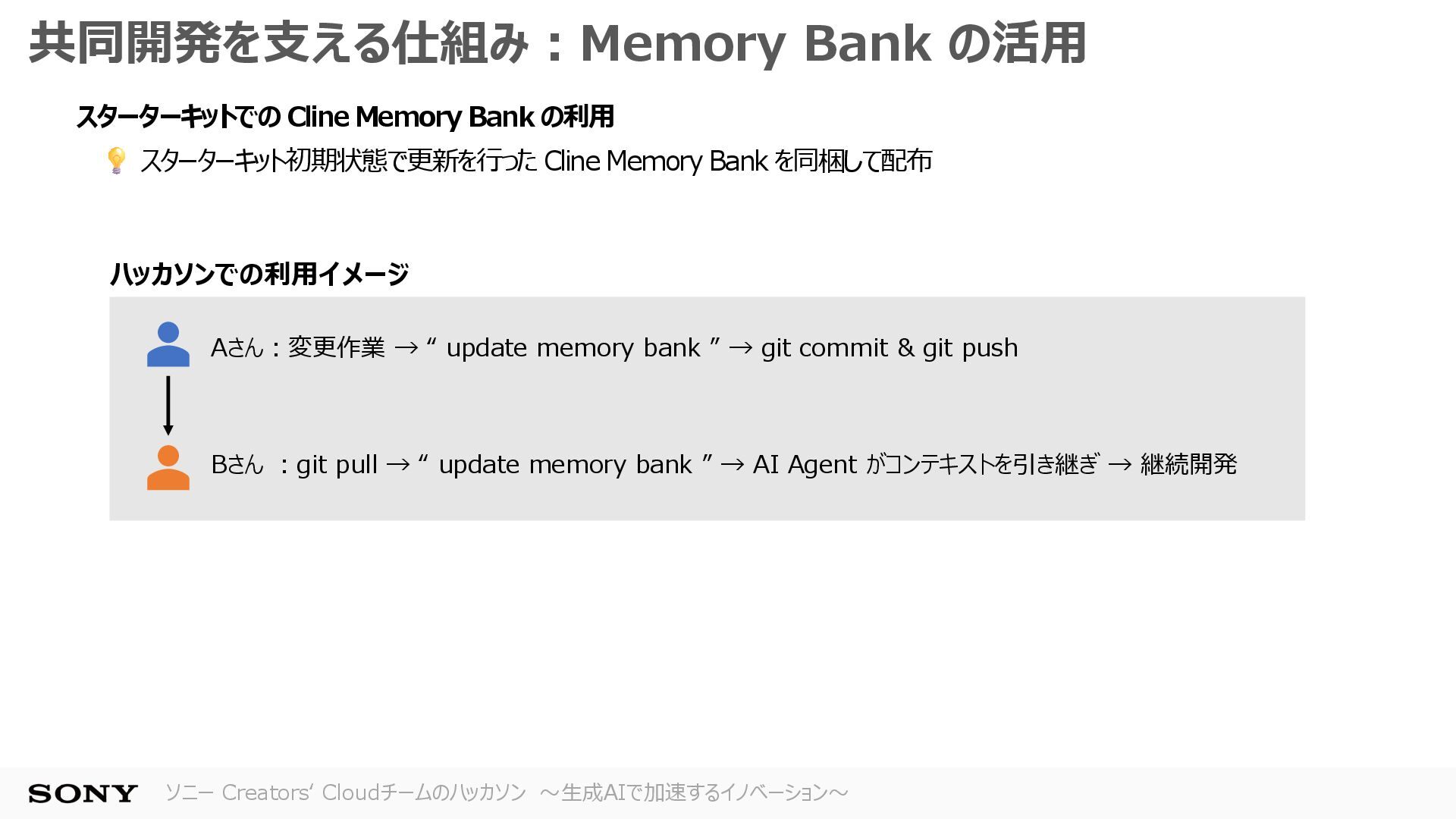サービス開発担当部長 2002年にソニー(株)に入社し、カメラ組み込みエンジニアとして一眼カメラや業務用カムコーダーのUI開発に 従事。中国販売会社への2年間の赴任を経験し、顧客・ユーザーに寄り添ったソフトウェア開発を推進した。 その後、モバイル事業において、プロの映像クリエイターに特化したスマートフォン向けのカメラアプリの開発を主 導。現在はサービス領域にも取り組み、Creators‘ Cloudのプロジェクトマネージャーを担当している他、開発 部門において生成AIによるソフトウェア開発を推進している。 村山 裕哉 技術センター 商品設計第4部門 プラットフォーム2部 2018年にソニー(株)に入社。ソフトウェア開発者として、放送局向けソリューション、社内新規事業への参画 を経て、現在はコンシューマーカメラと連携するクラウド基盤の開発に従事。AWSを利用した開発、特にサー バーレスを得意領域とする。スクラムマスターを担い、自分自身やチーム全体の段取りをより良くするために研 鑽を続けている。 平松 知樹 技術センター 商品設計第4部門 プラットフォーム2部 2020年にソニー(株)に入社し、ソフトウェア開発者として、クラウド基盤を活用したコンシューマーカメラの連携 システムや、ロボティクス領域の通信最適化に関わる開発に従事。現在は、リモートカメラ制御システムの開発 や、AI技術による次世代の撮影体験の実現に取り組んでいる。