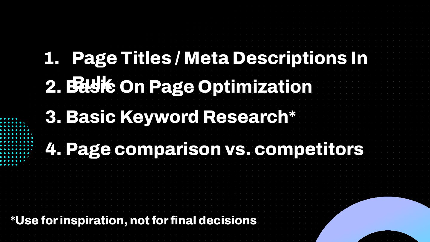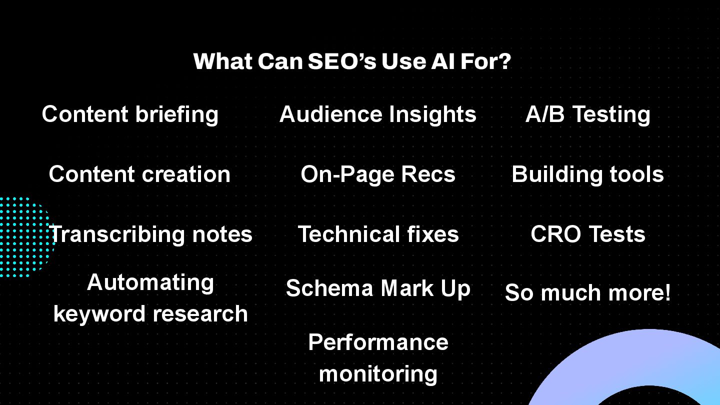 Transcribing notes Automating keyword research Audience Insights On-Page Recs Technical fixes Schema Mark Up Performance monitoring A/B Testing Building tools CRO Tests So much more!