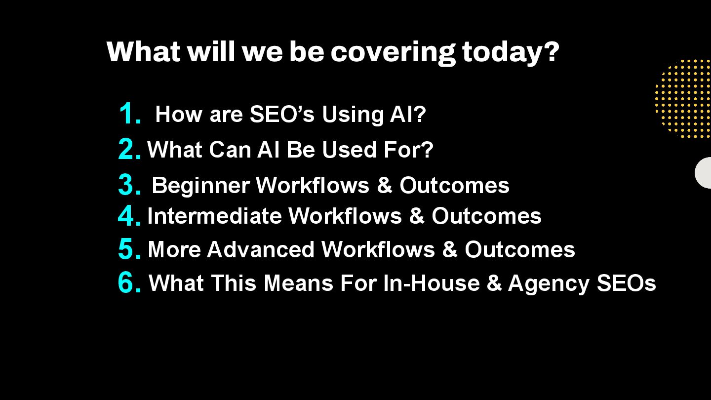 AI? 1. What Can AI Be Used For? 2. 3. Beginner Workflows & Outcomes 4. Intermediate Workflows & Outcomes 5. More Advanced Workflows & Outcomes 6. What This Means For In-House & Agency SEOs