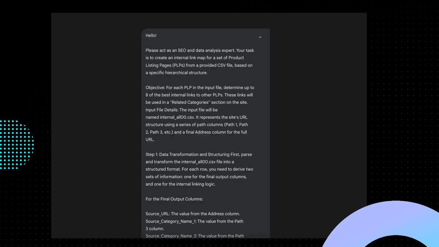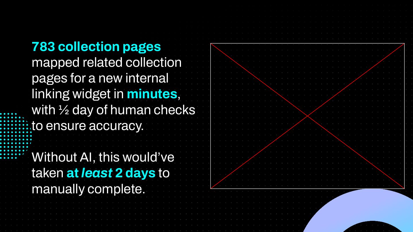 internal linking widget in minutes, with ½ day of human checks to ensure accuracy. Without AI, this would’ve taken at least 2 days to manually complete.