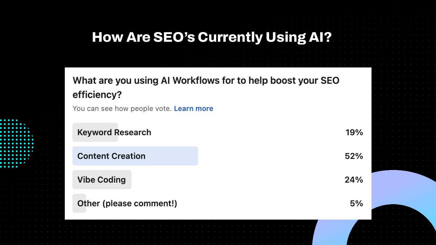 US And what I’ve seen the most when it comes to AI is that there is a lot of hype and a lot of people building a lot of cool stuff…. But not a lot of actions that the everyday SEO specialist can integrate into their day to day.