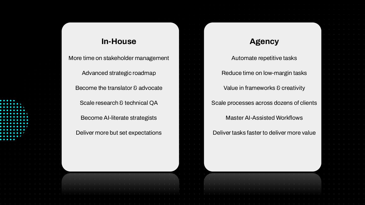 the translator & advocate Scale research & technical QA Become AI-literate strategists Deliver more but set expectations Agency Automate repetitive tasks Reduce time on low-margin tasks Value in frameworks & creativity Scale processes across dozens of clients Master AI-Assisted Workflows Deliver tasks faster to deliver more value
