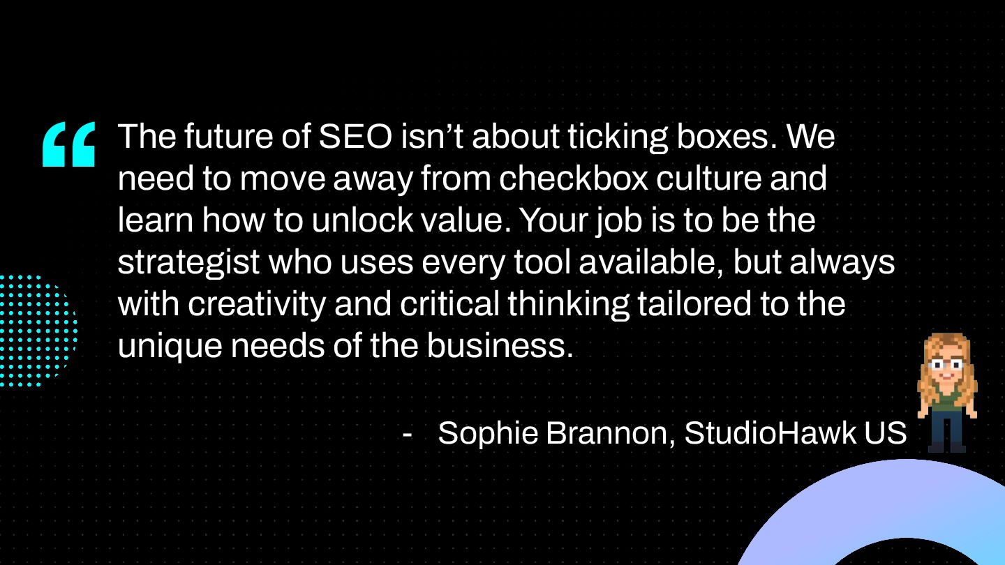 to move away from checkbox culture and learn how to unlock value. Your job is to be the strategist who uses every tool available, but always with creativity and critical thinking tailored to the unique needs of the business. “ - Sophie Brannon, StudioHawk US