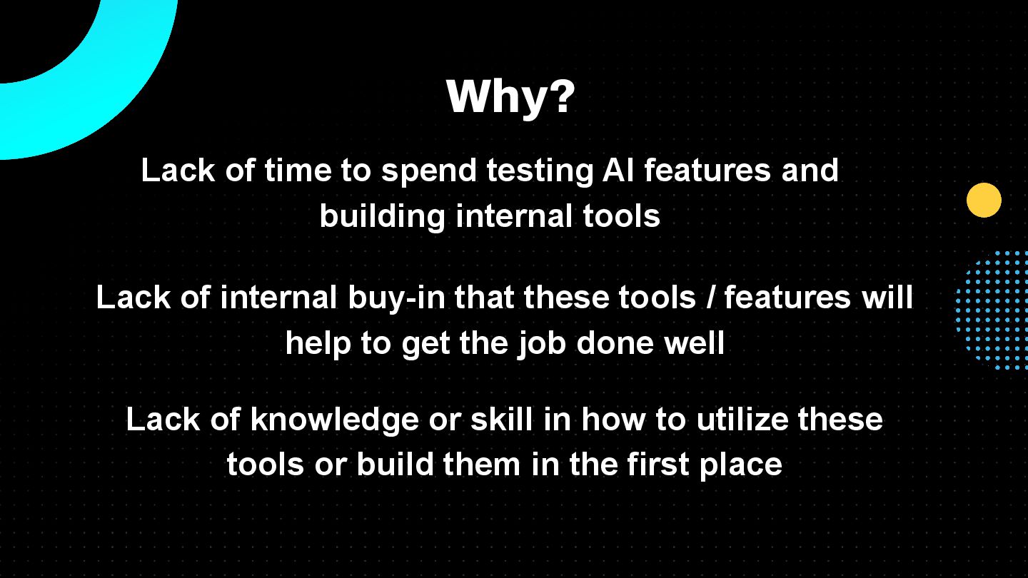 building internal tools Lack of internal buy-in that these tools / features will help to get the job done well Lack of knowledge or skill in how to utilize these tools or build them in the first place