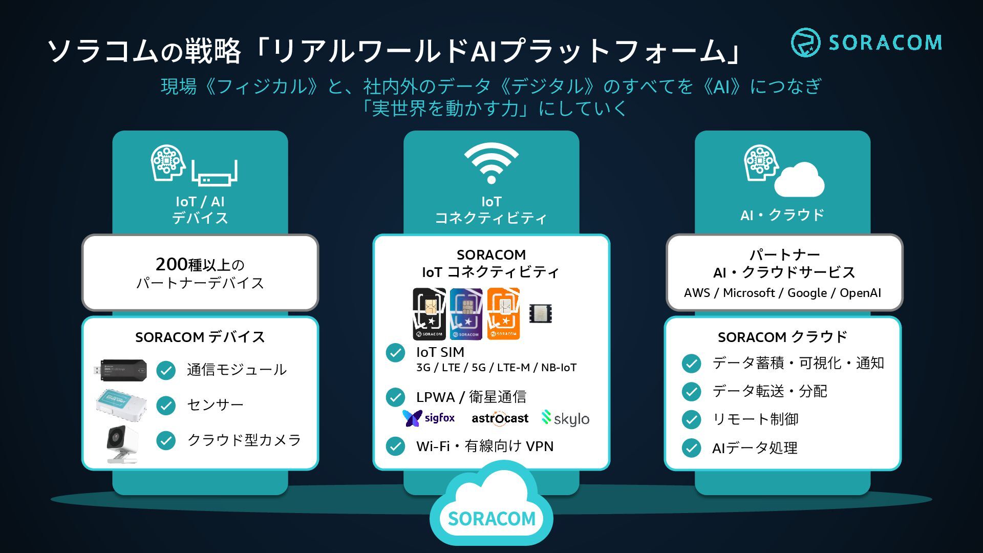ソラコムの戦略「リアルワールドAIプラットフォーム」 IoT / AI デバイス IoT コネクティビティ AI・クラウド 200種以上の パートナーデバイス