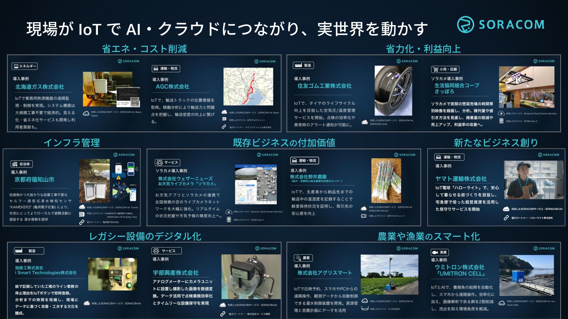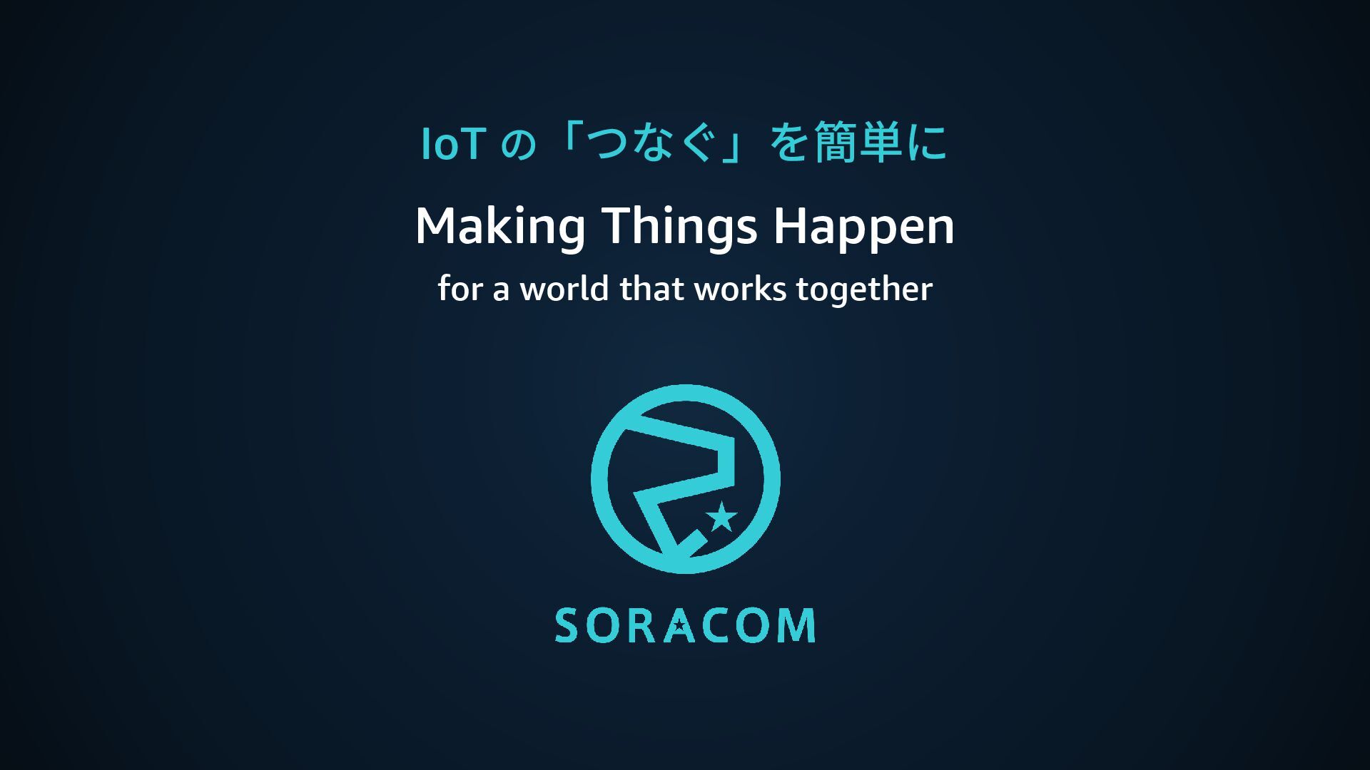 私たちがつくるのは、共鳴し合う世界です。 モノや人がつながり、それぞれの価値が増幅しあい 想像を超える未来が次々と生まれていく。 通信、クラウド、AIといったテクノロジーを だれもが使えるようにして、 志を共にするパートナーたちと共に世界をよくする イノベーションへとつなげる。 IoTと、その先へ。 株式会社ソラコム / SORACOM, INC. 代表取締役社長 玉川 憲 拠点 日本、英国、米国 事業概要 IoT プラットフォームサービスの提供 証券コード 147A (東京証券取引所 グロース市場) soracom.com