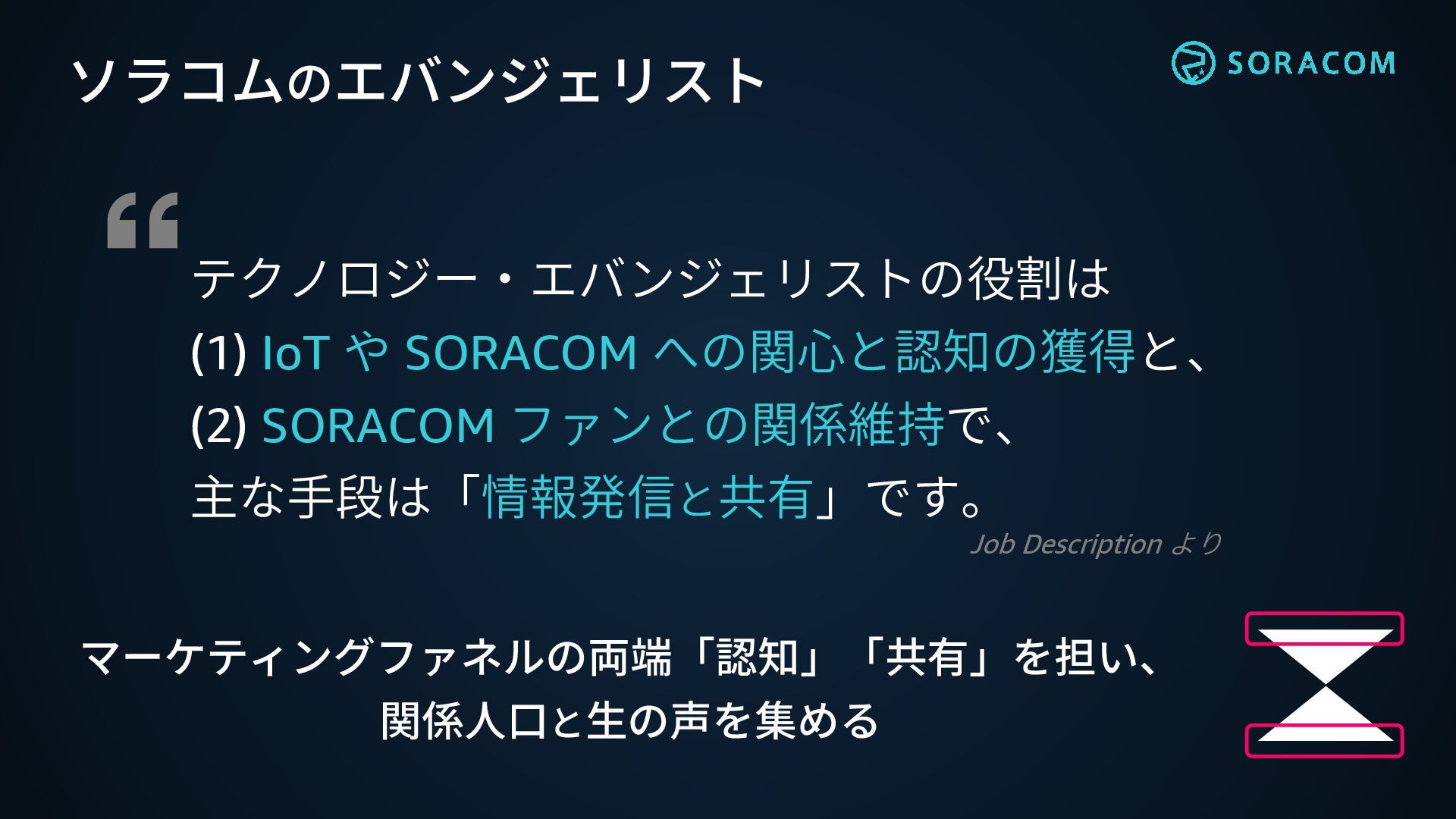 ソラコムのエバンジェリスト テクノロジー・エバンジェリストの役割は (1) IoT や SORACOM への関心と認知の獲得と、 (2) SORACOM ファンとの関係維持で、