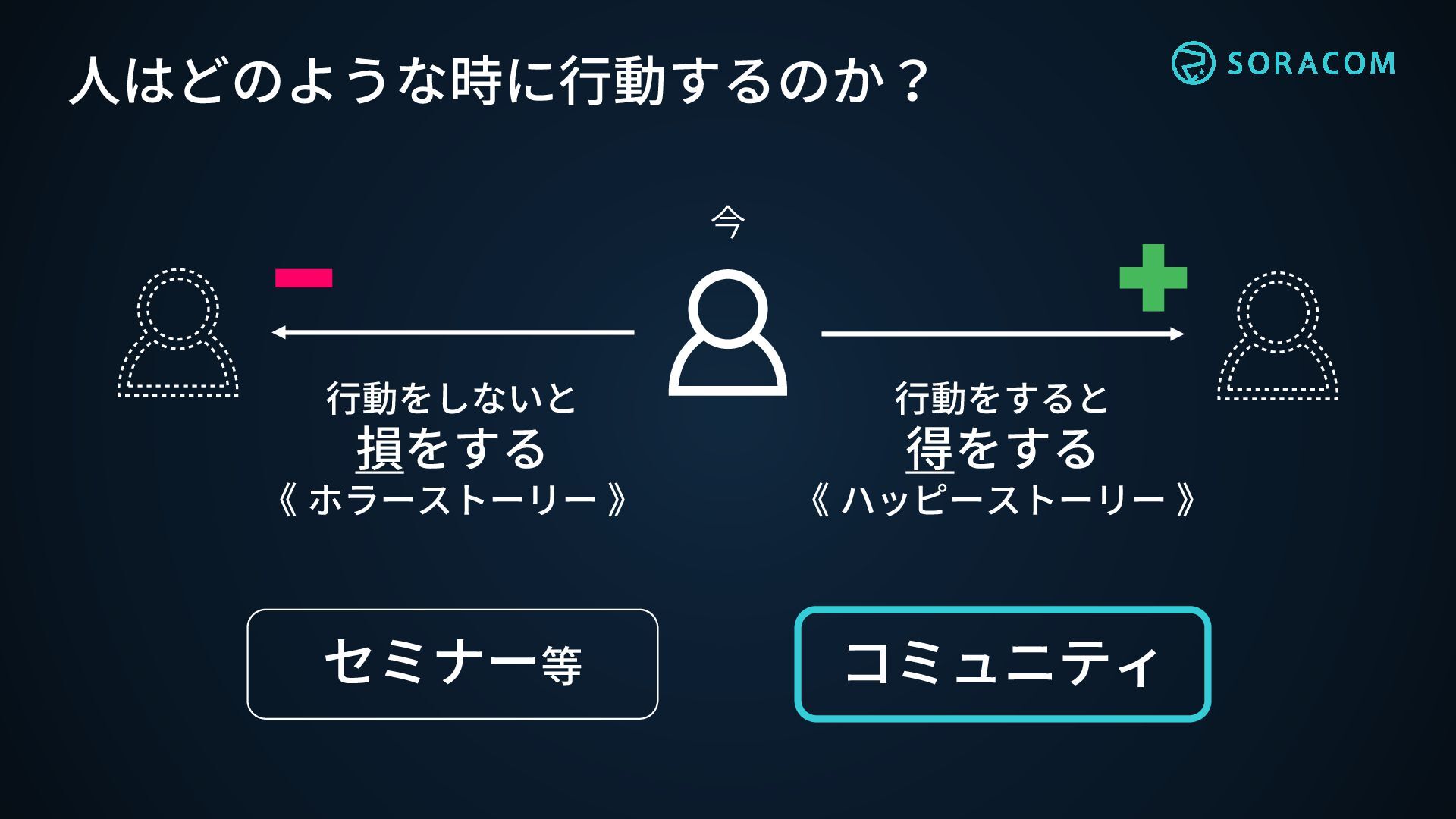 人はどのような時に行動するのか? 行動をしないと 損をする 《 ホラーストーリー 》 行動をすると 得をする 《 ハッピーストーリー