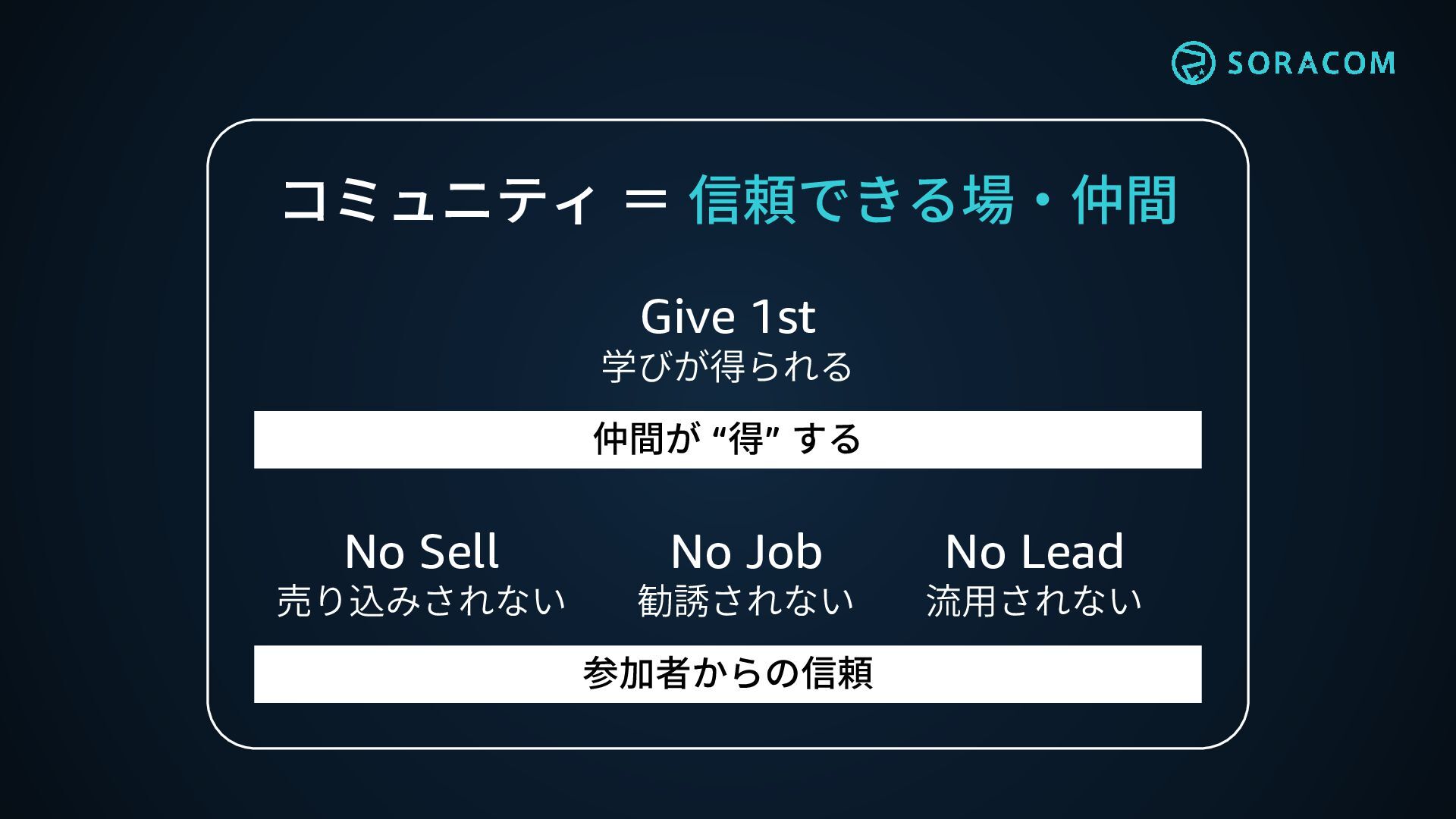 Sell 売り込みされない No Job 勧誘されない No Lead 流用されない Give 1st 学びが得られる 約束