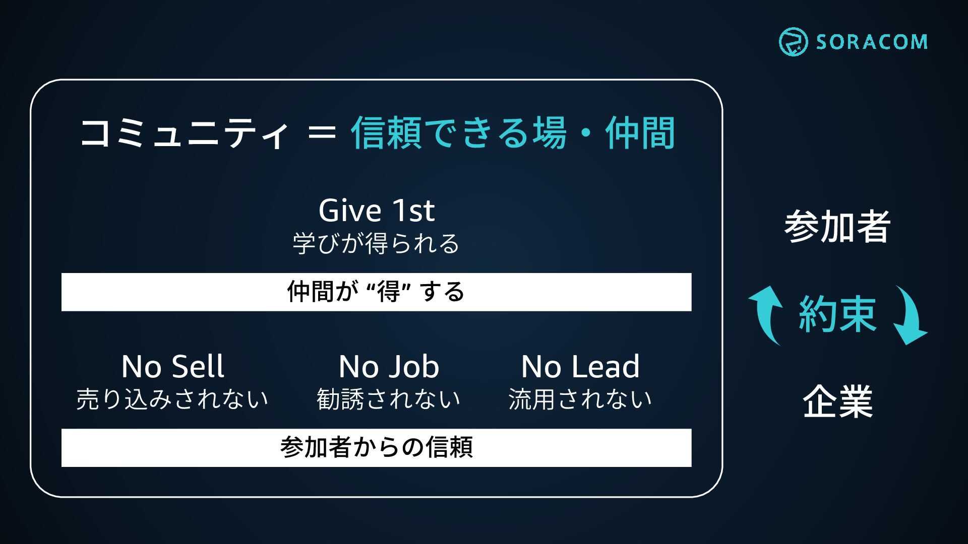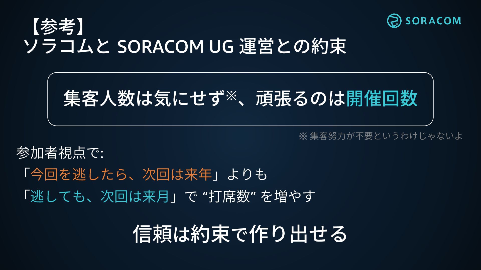 【参考】 ソラコムと SORACOM UG 運営との約束 参加者視点で: 「今回を逃したら、次回は来年」よりも 「逃しても、次回は来月」で “打席数” を増やす
