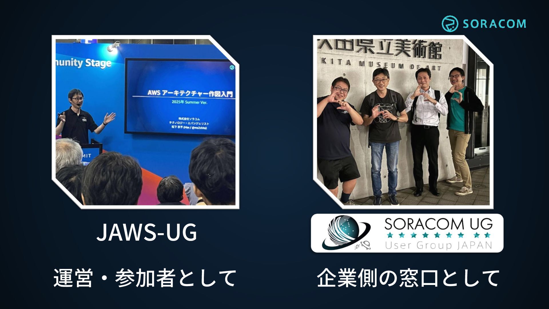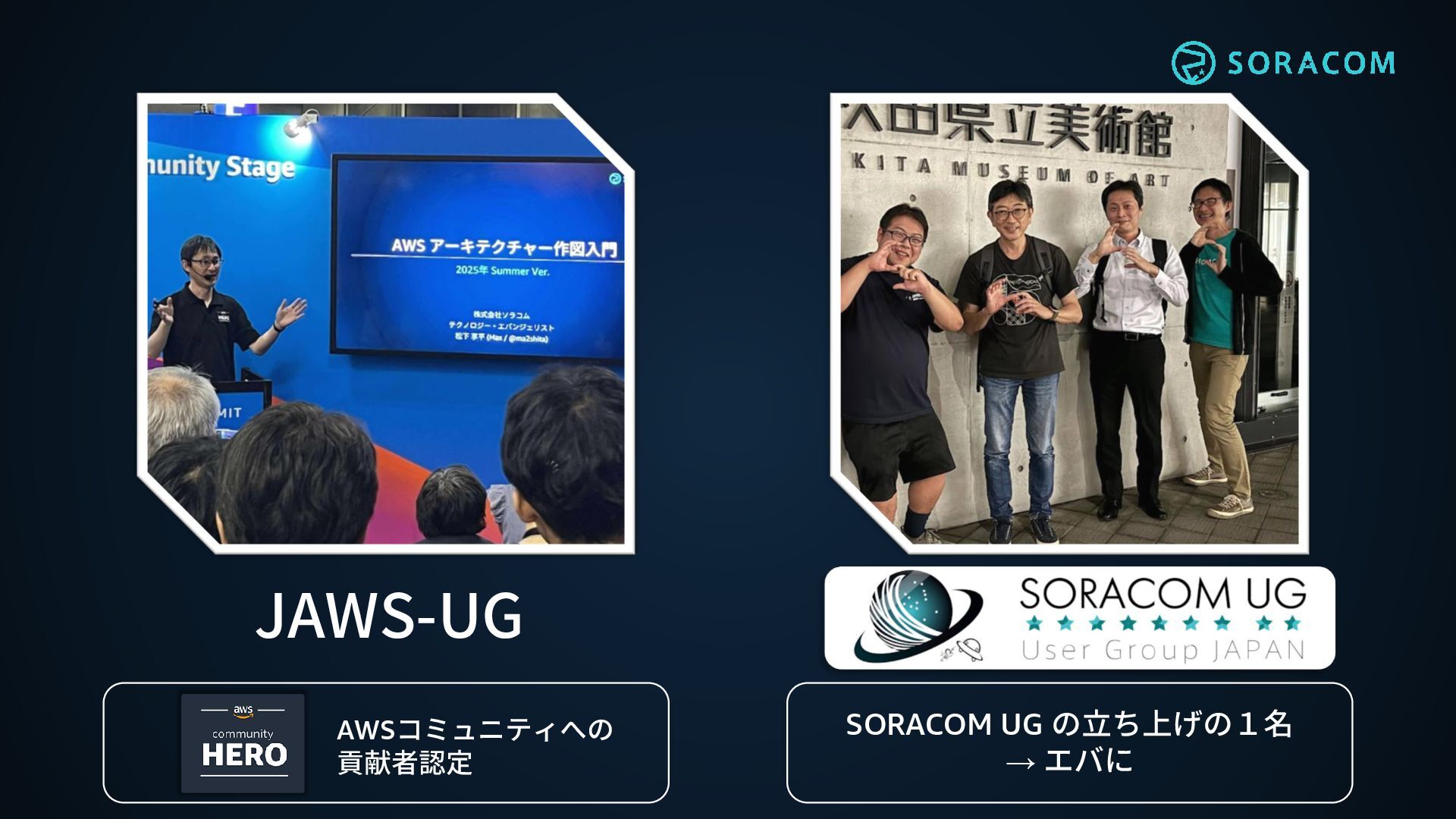 JAWS-UG AWSコミュニティへの 貢献者認定 SORACOM UG の立ち上げの1名 → エバに