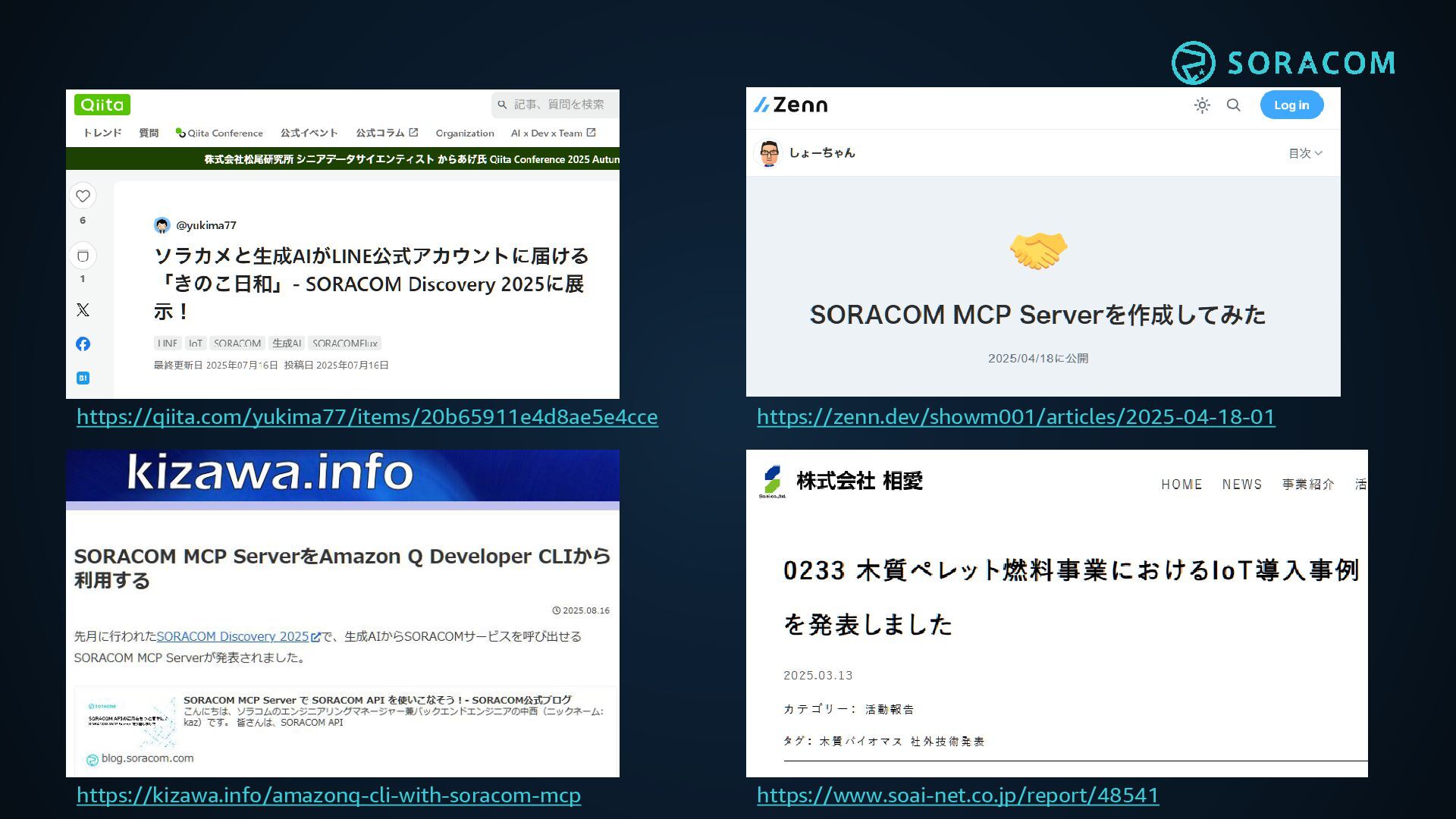 https://www.soai-net.co.jp/report/48541 https://kizawa.info/amazonq-cli-with-soracom-mcp https://zenn.dev/showm001/articles/2025-04-18-01 https://qiita.com/yukima77/items/20b65911e4d8ae5e4cce