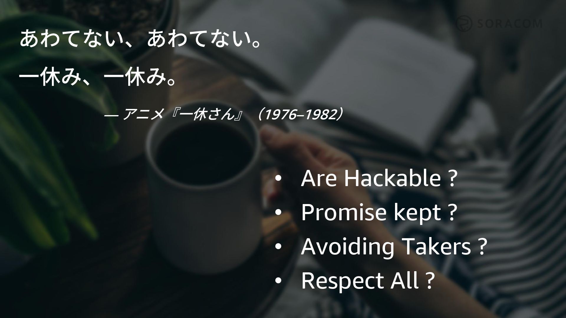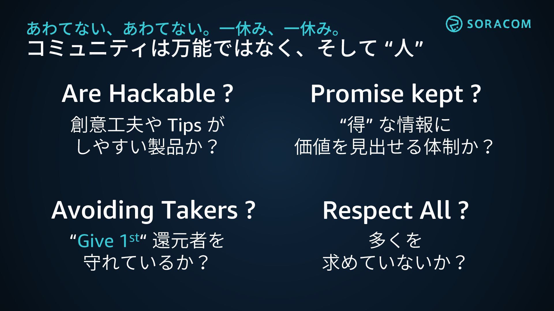 Promise kept ? “得” な情報に 価値を見出せる体制か? Avoiding Takers ? “Give 1st“ 還元者を 守れているか? Respect All ? 多くを 求めていないか?