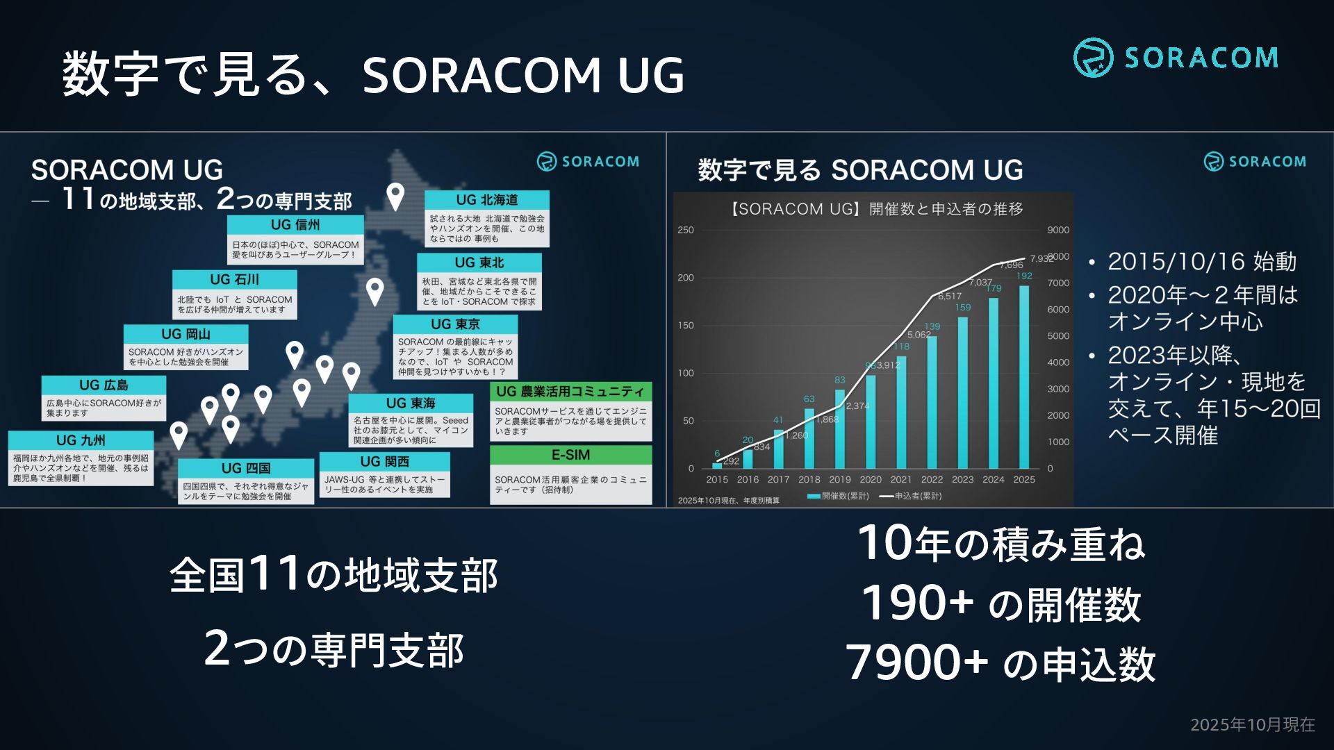 数字で見る、SORACOM UG 全国11の地域支部 2つの専門支部 10年の積み重ね 190+ の開催数 7900+ の申込数 2025年10月現在