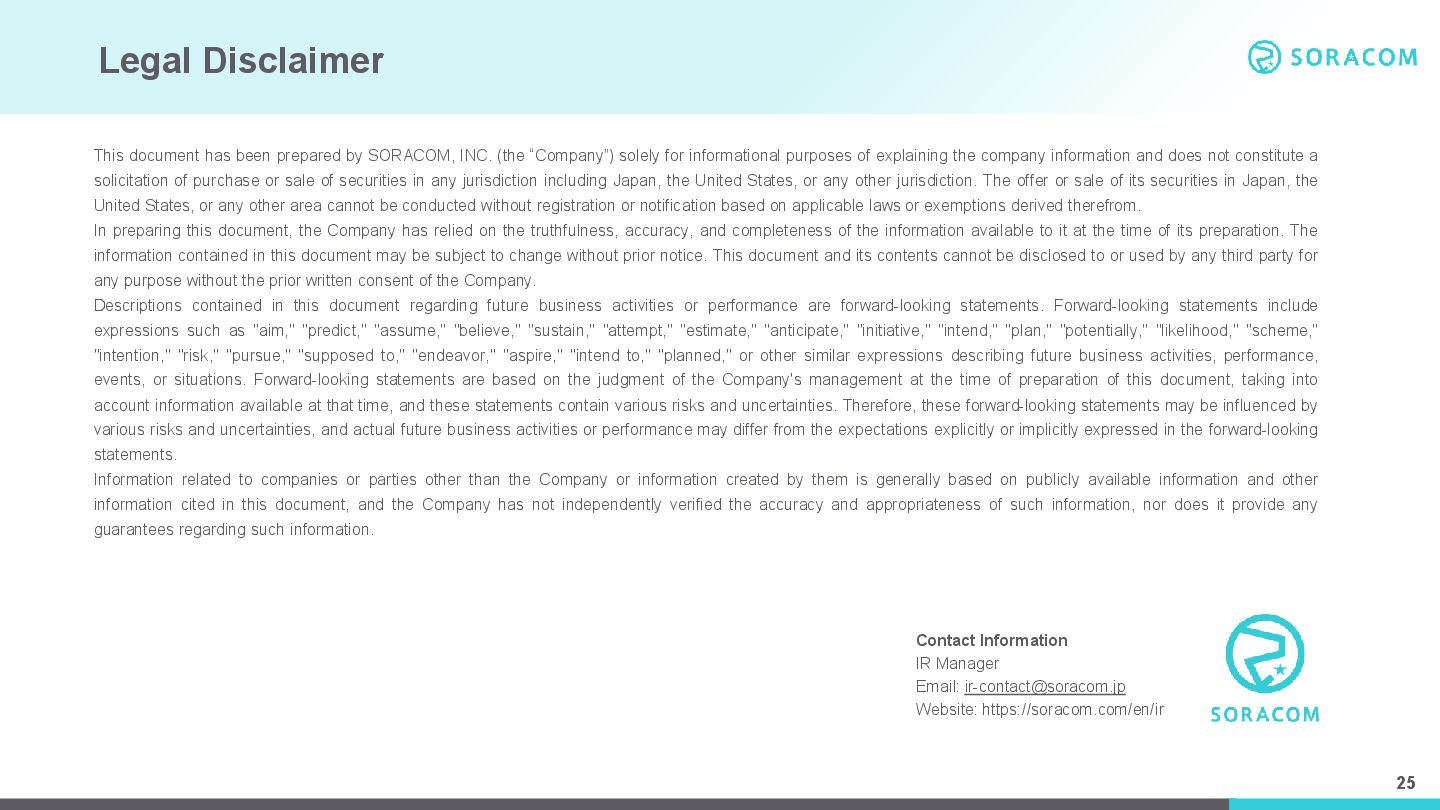 INC. (the “Company”) solely for informational purposes of explaining the company information and does not constitute a solicitation of purchase or sale of securities in any jurisdiction including Japan, the United States, or any other jurisdiction. The offer or sale of its securities in Japan, the United States, or any other area cannot be conducted without registration or notification based on applicable laws or exemptions derived therefrom. In preparing this document, the Company has relied on the truthfulness, accuracy, and completeness of the information available to it at the time of its preparation. The information contained in this document may be subject to change without prior notice. This document and its contents cannot be disclosed to or used by any third party for any purpose without the prior written consent of the Company. Descriptions contained in this document regarding future business activities or performance are forward-looking statements. Forward-looking statements include expressions such as "aim," "predict," "assume," "believe," "sustain," "attempt," "estimate," "anticipate," "initiative," "intend," "plan," "potentially," "likelihood," "scheme," "intention," "risk," "pursue," "supposed to," "endeavor," "aspire," "intend to," "planned," or other similar expressions describing future business activities, performance, events, or situations. Forward-looking statements are based on the judgment of the Company's management at the time of preparation of this document, taking into account information available at that time, and these statements contain various risks and uncertainties. Therefore, these forward-looking statements may be influenced by various risks and uncertainties, and actual future business activities or performance may differ from the expectations explicitly or implicitly expressed in the forward-looking statements. Information related to companies or parties other than the Company or information created by them is generally based on publicly available information and other information cited in this document, and the Company has not independently verified the accuracy and appropriateness of such information, nor does it provide any guarantees regarding such information. Contact Information IR Manager Email: