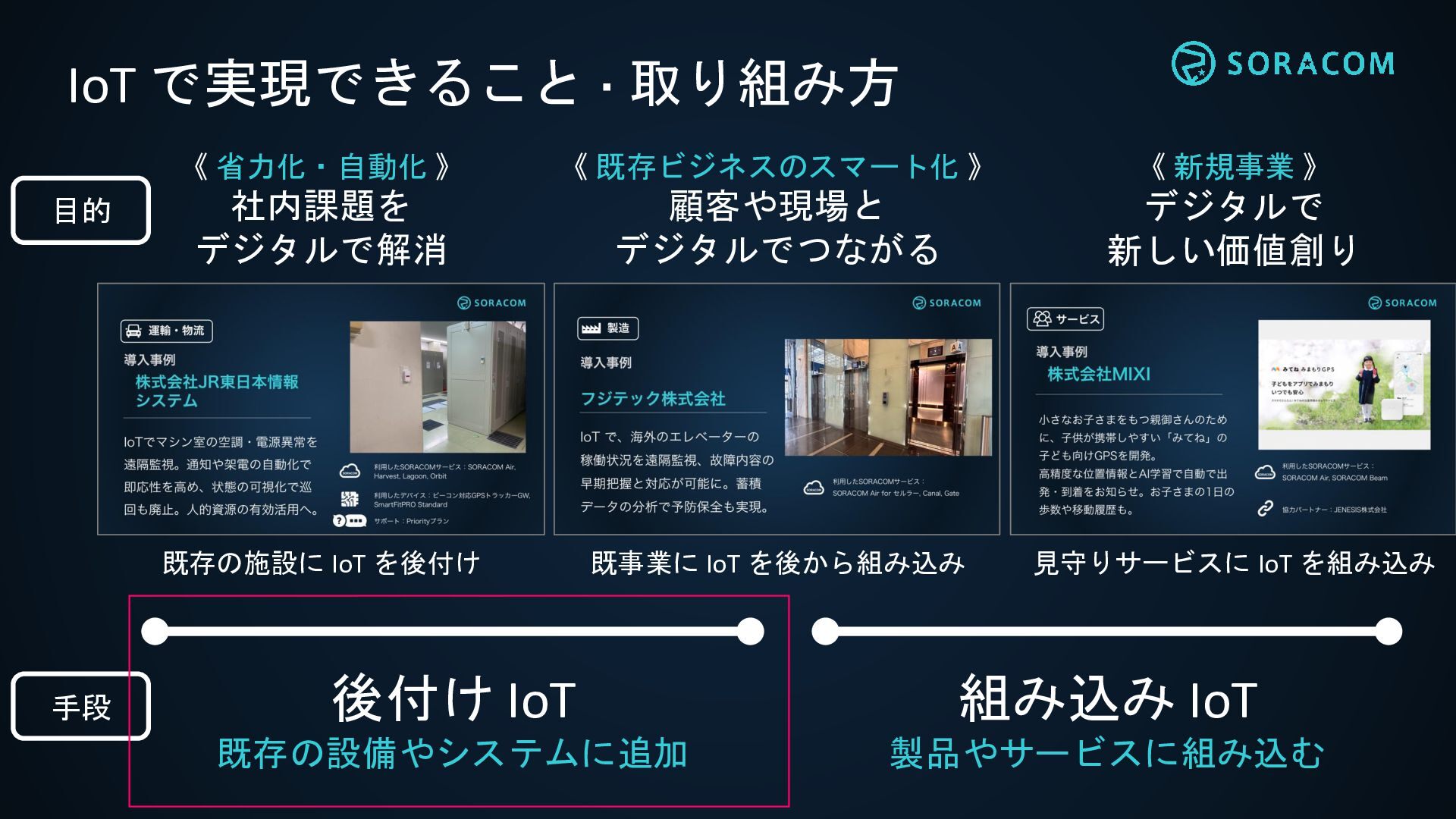 顧客や現場と デジタルでつながる 《 新規事業 》 デジタルで 新しい価値創り 後付け IoT 既存の設備やシステムに追加 組み込み IoT 製品やサービスに組み込む 目的 手段 既存の施設に IoT を後付け 既事業に IoT を後から組み込み 見守りサービスに IoT を組み込み