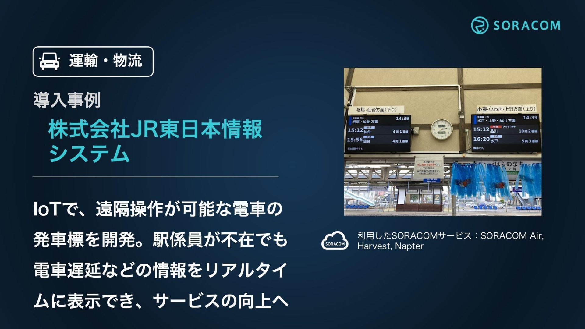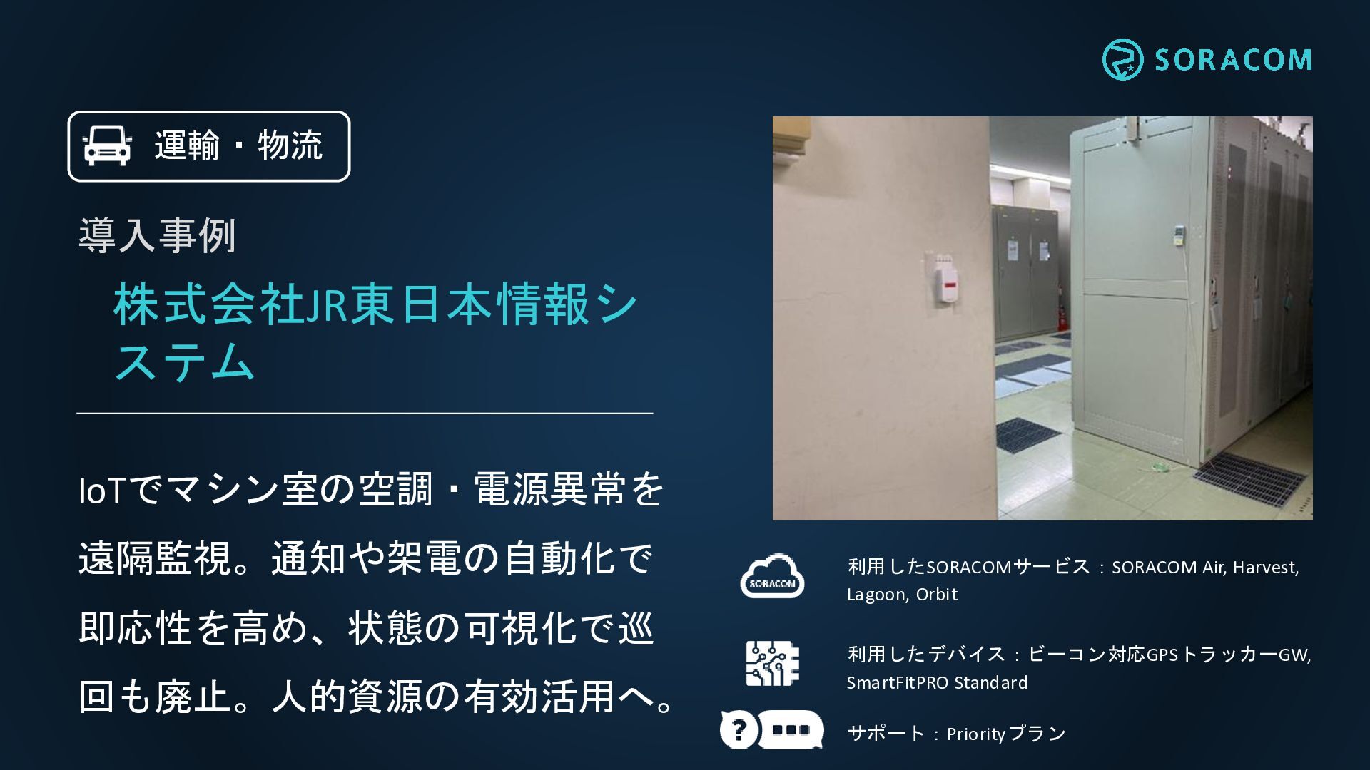 株式会社JR東日本情報シ ステム IoTでマシン室の空調・電源異常を 遠隔監視。通知や架電の自動化で 即応性を高め、状態の可視化で巡 回も廃止。人的資源の有効活用へ。 利用したSORACOMサービス:SORACOM Air, Harvest, Lagoon,