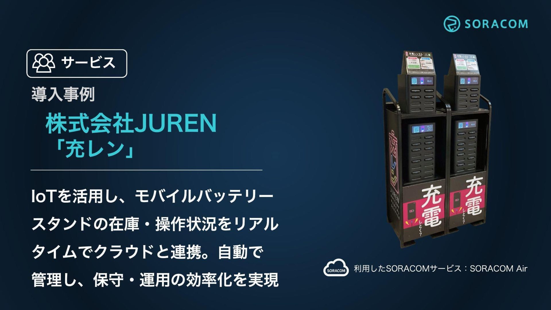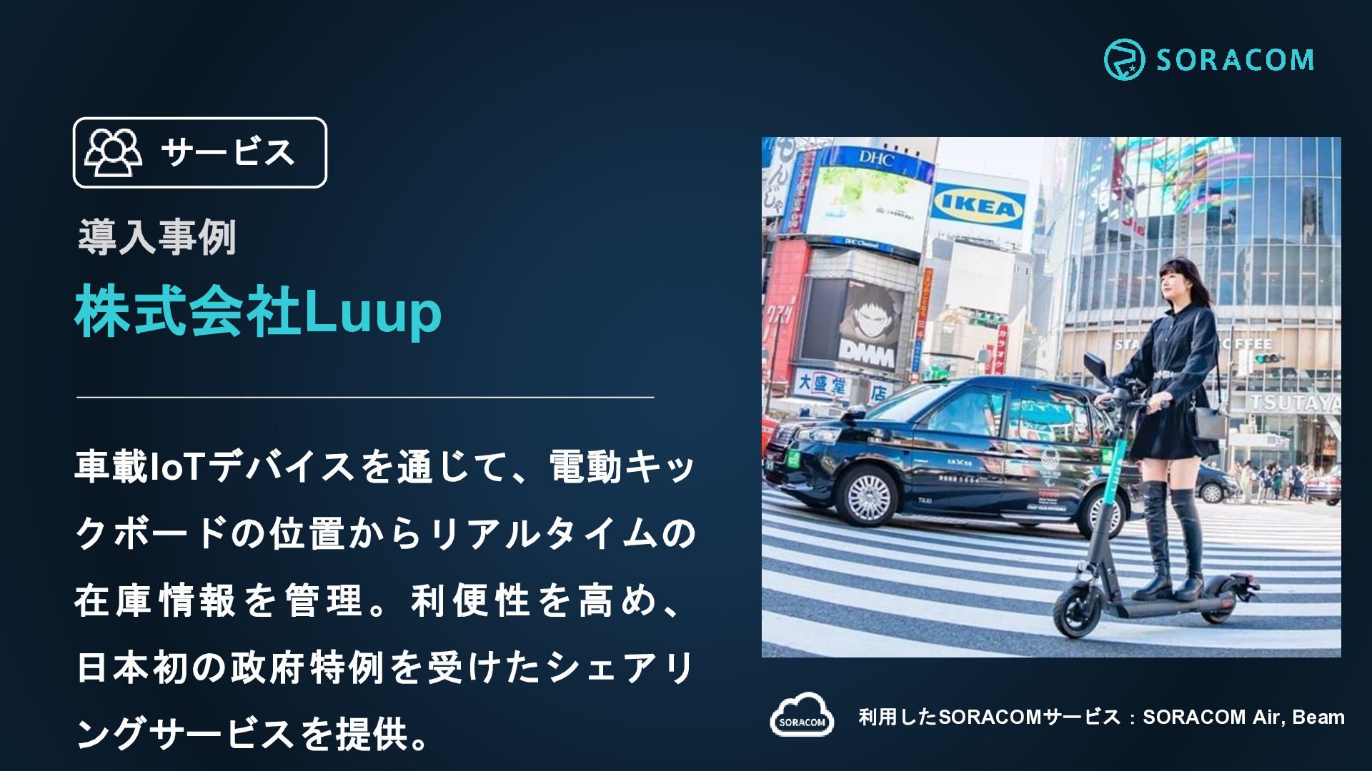 株式会社Luup 車載IoTデバイスを通じて、電動キッ クボードの位置からリアルタイムの 在庫情報を管理。利便性を高め、 日本初の政府特例を受けたシェアリ ングサービスを提供。 利用したSORACOMサービス:SORACOM Air, Beam サービス