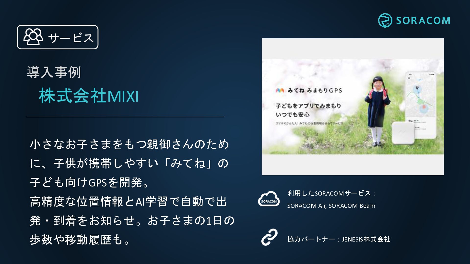 株式会社MIXI 小さなお子さまをもつ親御さんのため に、子供が携帯しやすい「みてね」の 子ども向けGPSを開発。 高精度な位置情報とAI学習で自動で出 発・到着をお知らせ。お子さまの1日の 歩数や移動履歴も。 利用したSORACOMサービス: SORACOM Air,