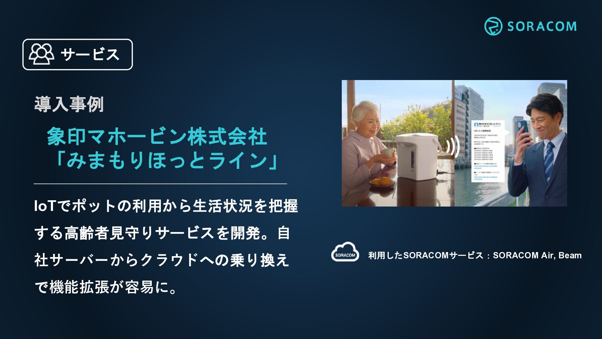 象印マホービン株式会社 「みまもりほっとライン」 IoTでポットの利用から生活状況を把握 する高齢者見守りサービスを開発。自 社サーバーからクラウドへの乗り換え で機能拡張が容易に。 利用したSORACOMサービス:SORACOM Air, Beam 導入事例