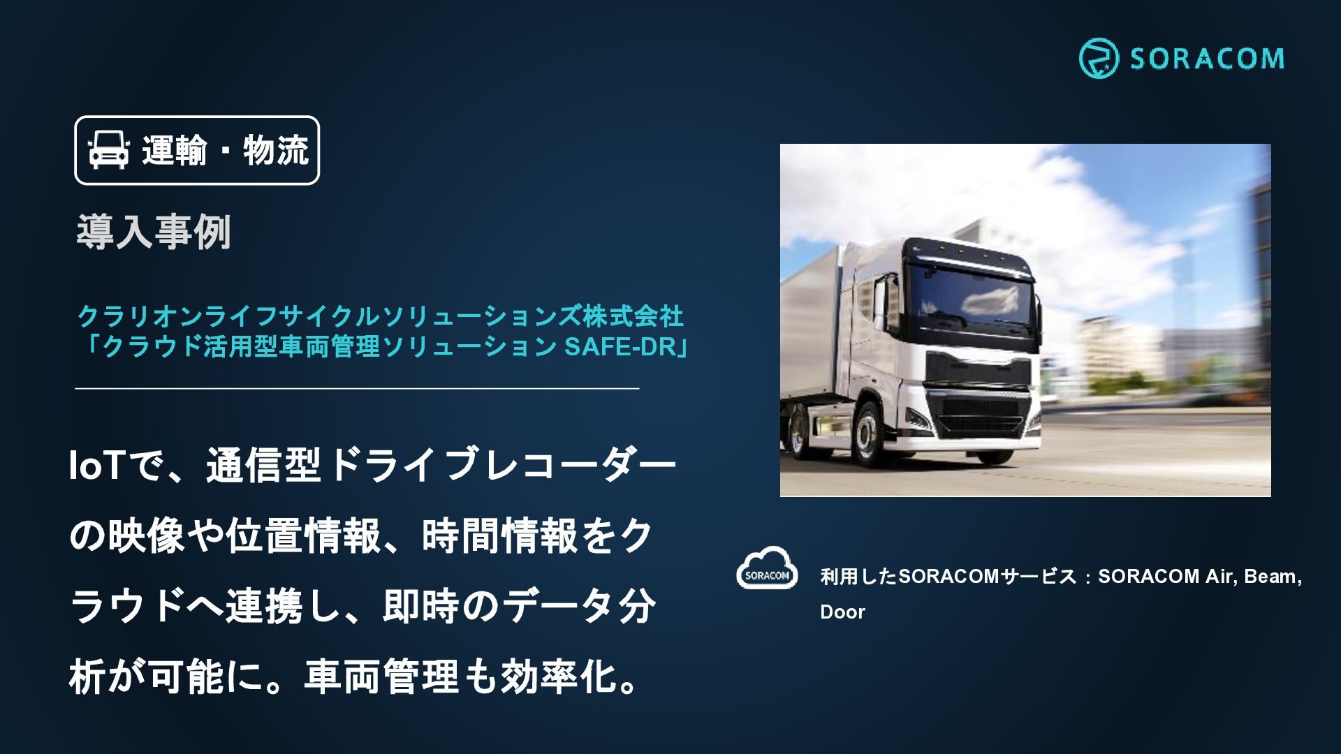 クラリオンライフサイクルソリューションズ株式会社 「クラウド活用型車両管理ソリューション SAFE-DR」 IoTで、通信型ドライブレコーダー の映像や位置情報、時間情報をク ラウドへ連携し、即時のデータ分 析が可能に。車両管理も効率化。 利用したSORACOMサービス:SORACOM Air, Beam,