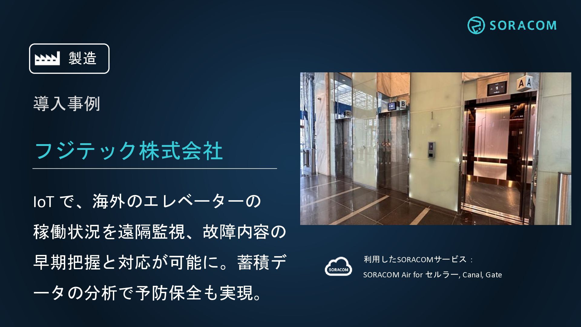 フジテック株式会社 IoT で、海外のエレベーターの 稼働状況を遠隔監視、故障内容の 早期把握と対応が可能に。蓄積デ ータの分析で予防保全も実現。 利用したSORACOMサービス: SORACOM Air for