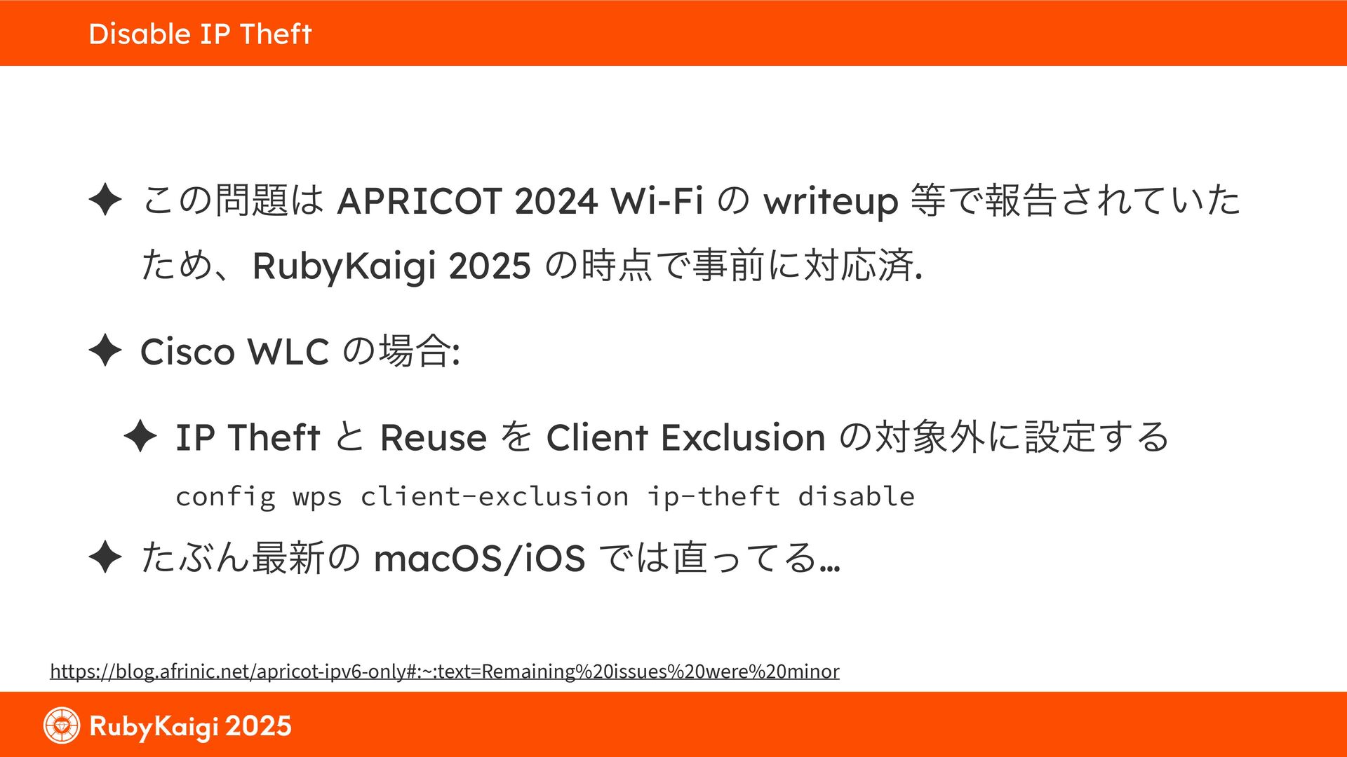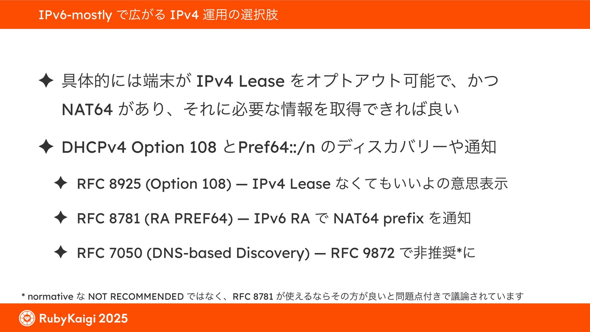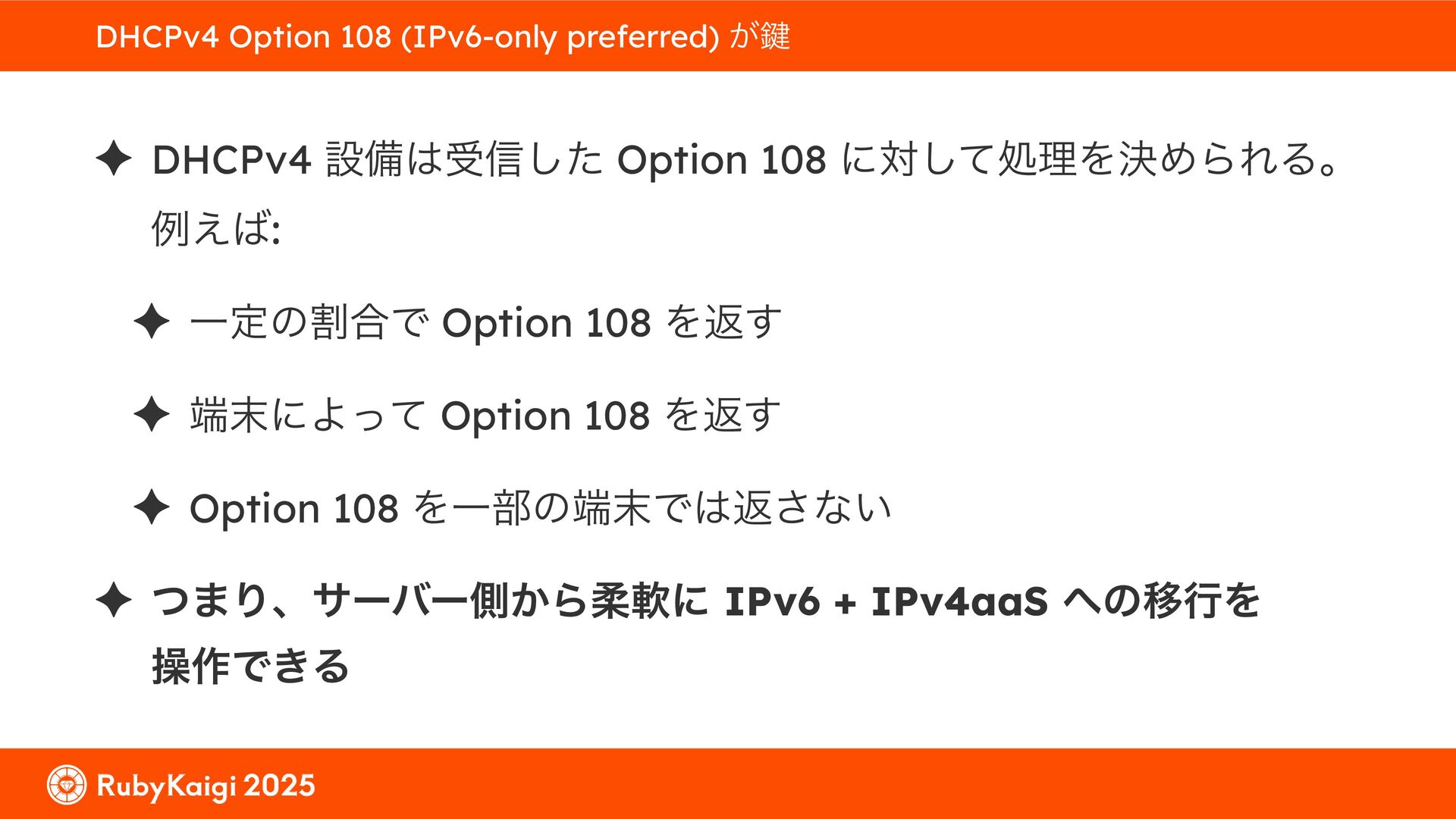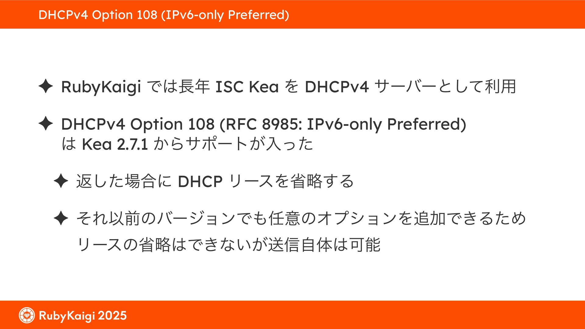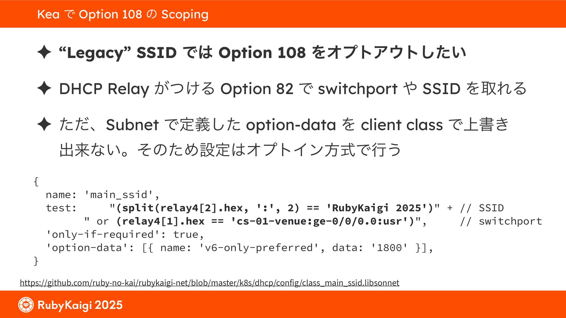 ͕͚ͭΔ Option 82 Ͱ switchport SSID ΛऔΕΔ ✦ ͨͩɺSubnet Ͱఆٛͨ͠ option-data Λ client class Ͱ্ॻ͖ ग़དྷͳ͍ɻͦͷͨΊઃఆΦϓτΠϯํࣜͰߦ͏ Kea Ͱ Option 108 ͷ Scoping https://github.com/ruby-no-kai/rubykaigi-net/blob/master/k8s/dhcp/config/class_main_ssid.libsonnet { name: 'main_ssid', test: "(split(relay4[2].hex, ':', 2) == 'RubyKaigi 2025')" + // SSID " or (relay4[1].hex == 'cs-01-venue:ge-0/0/0.0:usr')", // switchport 'only-if-required': true, 'option-data': [{ name: 'v6-only-preferred', data: '1800' }], }